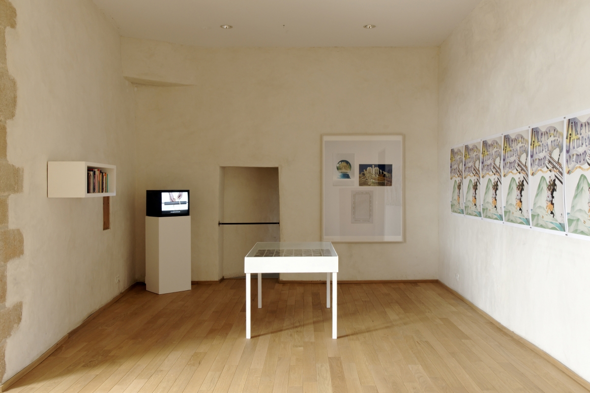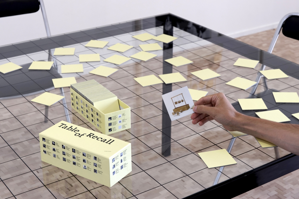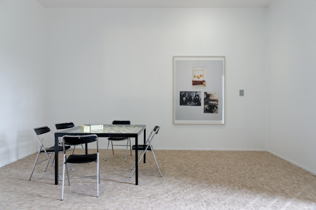 C’est dans un véritable jeu de cartes que se cristallise au mieux l’art digressif d’Aurélien Froment. Posée à l’envers sur une table, chaque carte est frappée d’une image plus ou moins anodine : oranger, ruine, masque, horloge, lumière, fauteuil, brique, gravure, esperluette, cactus, arbre, publicité, ruine encore, arbre encore… Certains de ces motifs se retrouvent dans des œuvres de Froment, d’autres surgissent de nulle part. Quiconque pénètre la salle peut s’installer à la table, et s’adonner à ce jeu en compagnie de ses compères. La règle est simple : il suffit de retourner à chaque fois une paire, puis d’inventer un lien verbal entre les deux clichés apparus, qui sache convaincre vos partenaires de la cohérence de votre réflexion et de l’évidence du rapprochement entre les deux images. Vous pouvez imaginer n’importe quelle fiction, vous lancer dans toutes les dérives intellectuelles, proposer des arguments délirants : tant que les mots sous-tendent la pertinence du duel, et que votre démonstration est acceptée par autrui, tout est permis.