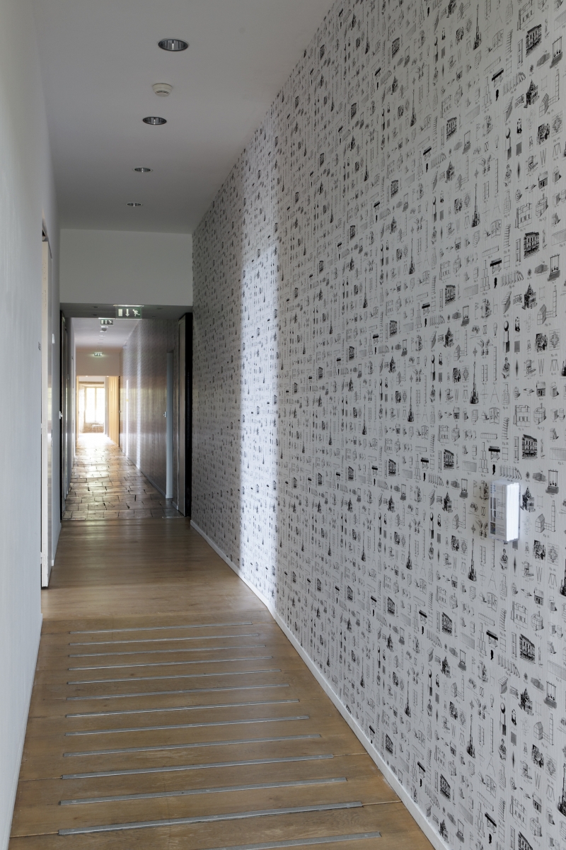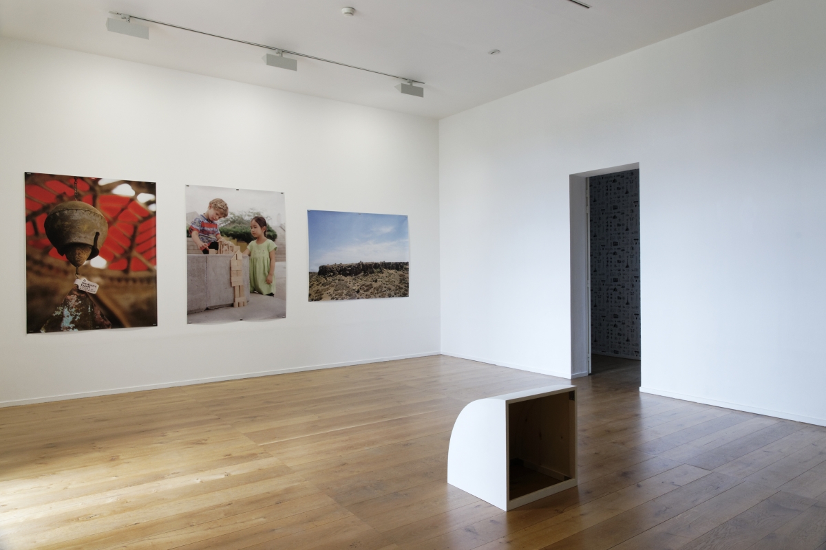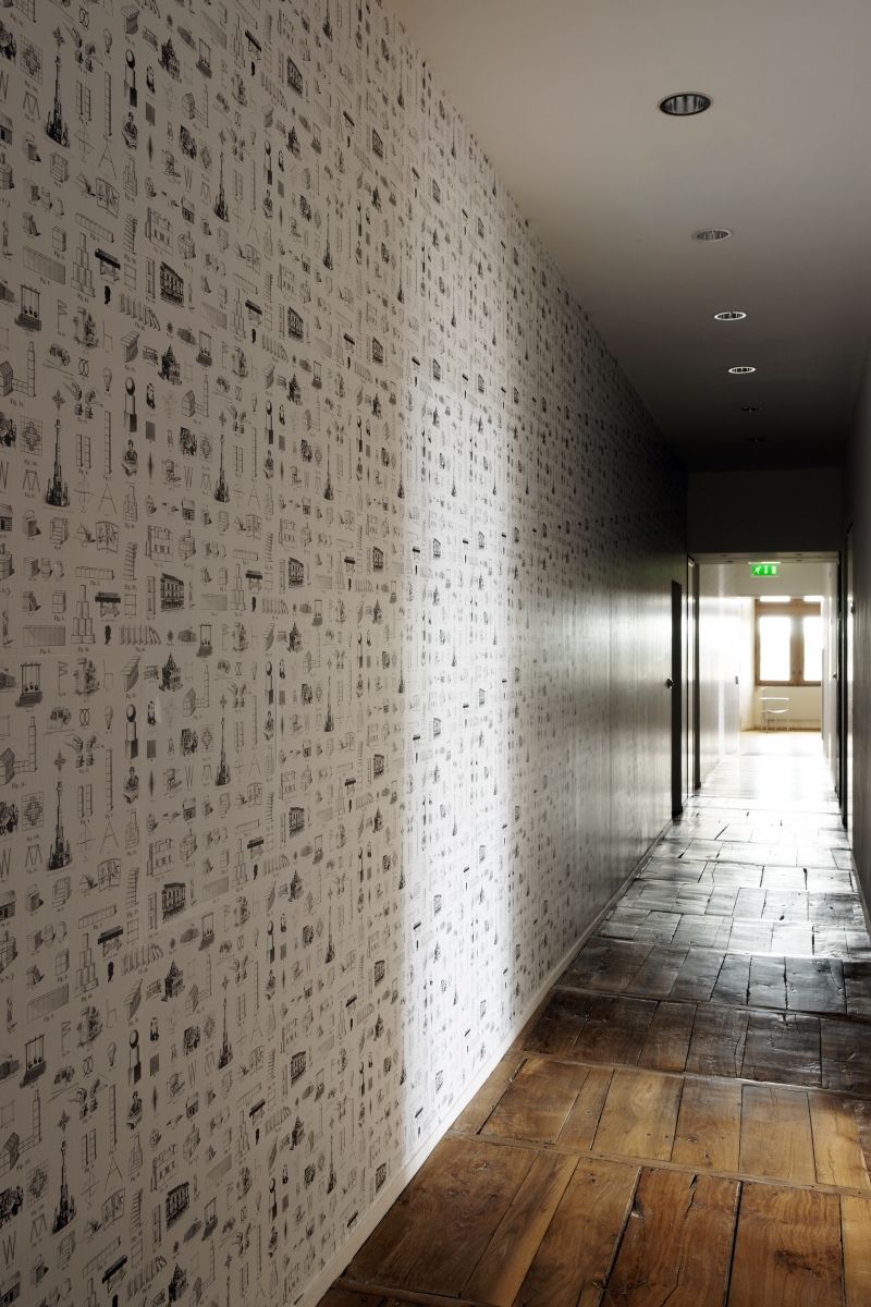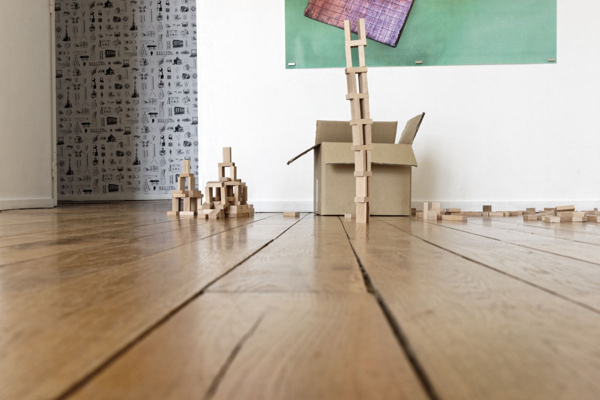 Et si c’était un rébus ? Mon tout serait alors comme une chasse au trésor, où le visiteur part en quête de mille coïncidences formelles et intellectuelles. Ainsi, collé sur le mur du long couloir du château, un papier peint s’inspirait des gravures contenues dans les manuels pédagogiques écrits à la fin du XIXe siècle par Friedrich Fröbel, l’inventeur des Kindergarten ou jardins d’enfant. Il a imaginé notamment des jouets de bois géométriques, destinés à favoriser l’inventivité des petits et à les aider à développer leur intelligence spatiale (certains historiens assurent même que nombre d’inventeurs de l’abstraction au début du XXe siècle auraient été nourris de ces inventions dès le plus jeune âge). Dans la salle suivante, les rectangles du papier peint sont à nouveau présents ; mais ils ont été transformés en plancher de bois, composant au sol comme une mosaïque : avec ses bords qui semblent frangés, et risquent de se décomposer, ce parquet instable a été réalisé par l’artiste en collaboration avec Ryan Gander, autre grand maître de l’énigme.