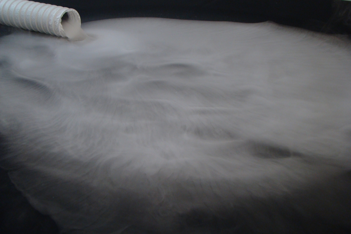 B.L. Map, comme toutes maquettes météorologiques, parle de la ville, un objet de fascination et d’amour très fort. J’aime la ville d’où je viens et pour la faire vibrer, comme au cinéma la météorologie fait vibrer l’image, ces particules font vibrer l’image et créent de l’espace. C’est la météorologie comme scénario, pas de narration, sauf la météorologie comme sujet de ce qui se passe, une façon de se faire vibrer avec l’irréel qui est propre au médium lui-même. J’aime bien, dans la façon dont la société a évolué, que la capacité d’émerveillement passe par des médiums comme le fantastique ou des objets projectionnels.