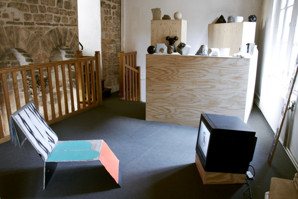 Le passage à l'étage supérieur se fait par un escalier en bois vernis, dont Aurélie Godard s'est amusée à accentuer la structure peu élégante afin qu'il puisse servir de socle aux modelages en terre d'Éléonore Cheneau. Plus ou moins identifiables, les objets de l'artiste dénivèlent sur ces supports en bois brut placés à différentes hauteurs (un peu plus haut, l'installation des pierres peintes à la gouache de Valérie du Chéné augmente ce dispositif). Dans cet espace de transition, un fauteuil mis à la disposition du public – où sont reliées des toiles peintes par la quasi totalité des artistes de l'exposition, comme dans un nuancier de textile démesuré – fait face à la vidéo sketch'up (2011) de Chloé Dugit-Gros. Manipulant différents matériaux et objets usuels au cours de petites scènes, l'artiste compose, en vitesse accélérée, des situations à l’aspect tour à tour pictural ou sculptural.