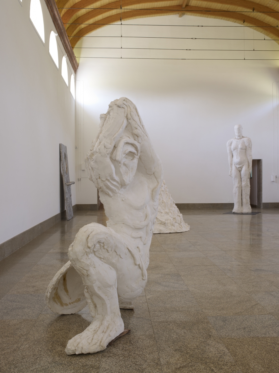 On entre dans l’exposition en passant sous un arc de triomphe ; un choix fort qui marque physiquement l’entrée dans l’univers singulier de l’artiste. D’un côté, l’envers du décor où tous les assemblages et les éléments constitutifs de la sculpture sont laissés volontairement apparents, de l’autre, deux personnages en relief, «finis», qui ne laissent pas présager de ce qui se passe derrière eux. J’y vois un clin d’œil notoire à la pratique classique de la sculpture en relief pratiquée au XIXe siècle jusqu’à Rodin qui, avec La Porte de l’enfer, rompt avec ces préceptes du relief (qui devait toujours suggérer ce qui se passait derrière les figures représentées…), mais aussi une mise en abîme, lancée au spectateur, de toutes les autres pratiques de la sculpture que l’artiste rejoue dans son travail.