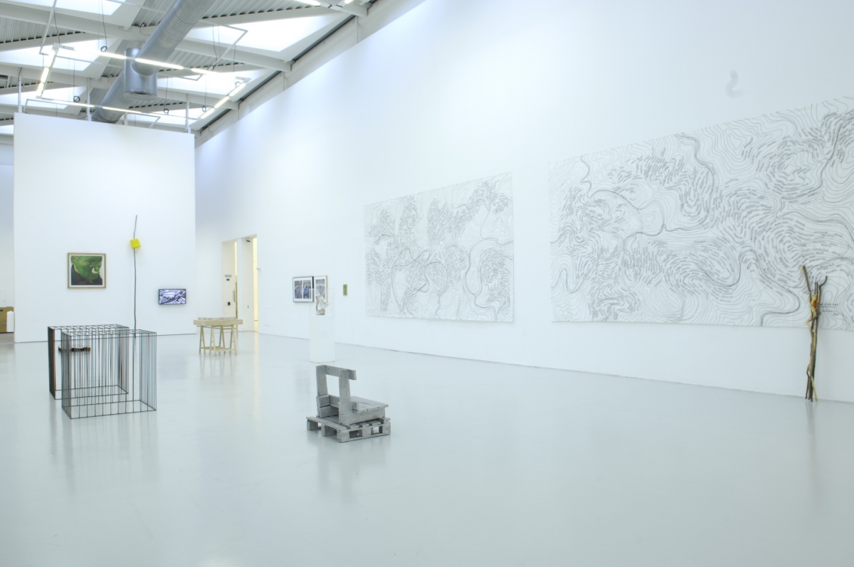 Enfin, deux magnifiques œuvres récentes nous conduisent du côté de la poésie et de la littérature. Deux grandes tentures de coton comparables par leurs proportions à d’immenses planisphères sont saturées de lignes sinueuses qui dessinent des strates ou des courbes de niveaux. Entre les lignes, des mots tirés de deux textes du poète français Jean Daive sont inscrits avec un feutre de peinture. Un texte résultant d’un entretien avec Paul Celan (Under the Dome) est éclaté en fragments verbaux brefs dont les séquences lacunaires invitent à la composition d’une nouvelle histoire, à une promenade mentale fugace. L’ensemble de l’exposition fonctionne d’ailleurs de cette manière : proposant des associations, des prélèvements, des appropriations et réinventions permanentes entre des objets à chaque fois singuliers mais unis par l’attitude commune qui a présidé à leur invention.