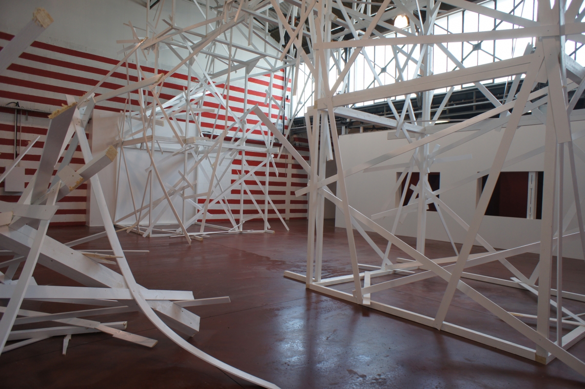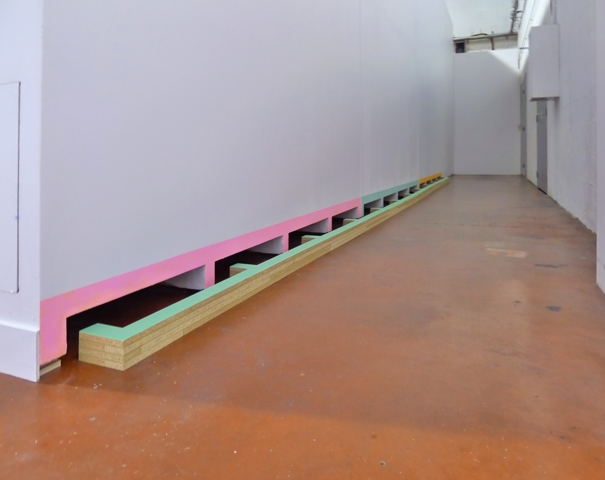 Comme un déplacement ou une «dissémination»5 de l’espace d’exposition, Christophe Cuzin a rouvert la voie en France à une expérimentation dans un champ commun de la peinture, de la sculpture et de l’architecture6. Ses bandes ou surfaces colorées, peintes sur les murs, le sol ou le plafond, jouent sur notre perception des plans et volumes, et dématérialisent l’architecture. Un mur plein semble devenir une surface autonome, «flottante» dans l’espace. A la Tôlerie, Cuzin intervient sur l’objet galerie, soulignant par une peinture-peau la structure de parpaings du bâtiment. La peinture est industrielle, appartient à une socialité collective. Christophe Cuzin se définit comme un peintre en bâtiment qui, par un geste impersonnel et au moyen d’un nuancier industriel, «use de matériaux et donc de couleurs déjà socialisées»7. De plus, l’appréhension à l‘échelle de l’espace d’exposition est collective, au sens où Walter Benjamin faisait la distinction entre réception individuelle en peinture et réception collective au cinéma et en architecture. Au premier volet du dyptique, présentant des intensités localisées espacées, répond le second volet, présentant des intensités qui occupent l’ensemble de l’espace de la Tôlerie. Aux matériaux de l’architecture, issus de l’industrie du bâtiment, fait place l’architecturation des lieux, une mise en espace «la plus significative de la rythmique d’une communauté»8. Cette architecture philosophique configure les pensées qui sont nécessaires à l’habitation du monde.9 Et de ce point de vue, il existe un écart, un jeu dans la différence, entre les deux types d’habitation de l’espace que sont les installations des artistes Clemens Hollerer et Krijn de Koning. Ce dernier nous a habitués à des installations dans l’espace architectural où il intervient souvent seul. Michel Gauthier nous rappelle que Krijn de Koning travaille sur des seuils colorés et architecturés. L’œuvre devient alors un appareil de vision10. Clemens Hollerer construit également des «site-specific sculptures». L’enchevêtrement de morceaux de bois est ici positionné dans l’espace d’une travée du bâtiment, où la hauteur et la densité des éléments répondent aux formes de sa structure métallique. Les couleurs sont généralement liées à leurs fonctionnalités, comme une signalétique abstraite, et elles renvoient à un extérieur de l‘espace d‘exposition. L’installation des deux artistes devient respectivement appareil de vision de l‘autre. Par exemple, deux fenêtres de l’installation de de Koning cadrent sur la pièce d’Hollerer. L’être ensemble de ces deux pièces est plus qu’une coexistence, moins qu’une construction commune, mais plutôt une «struction» au sens de Jean-Luc Nancy11 (un agencement d‘éléments qui esquisse un sens), crée un espace du jeu entre les deux pièces. Le déplacement du corps du visiteur dans l’espace de la Tôlerie en déploie la chorégraphie. La bonne distance entre les pièces permet de vivre les propriétés haptiques de chacune, et de se frayer des passages entre elles. Chacune est vécue de manière différente comme arche, passage (à la fois l’objet architectural et l’acte de son franchissement), et labyrinthe.