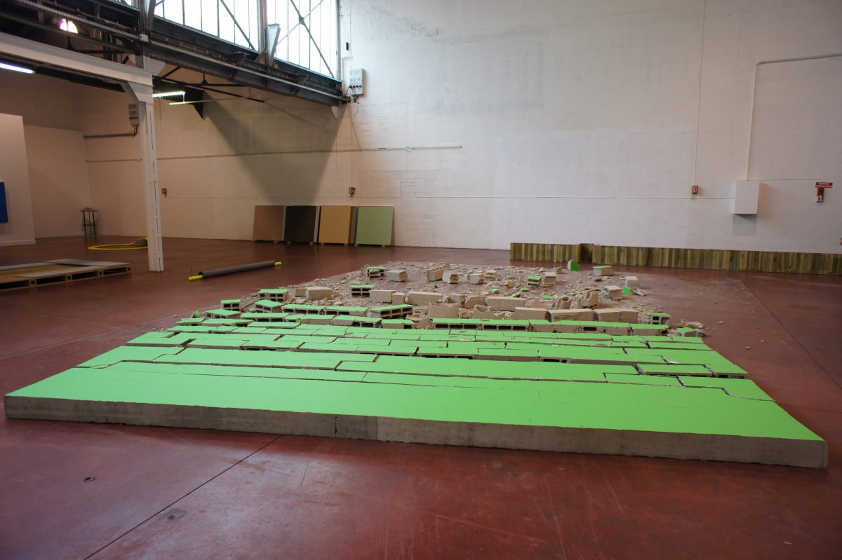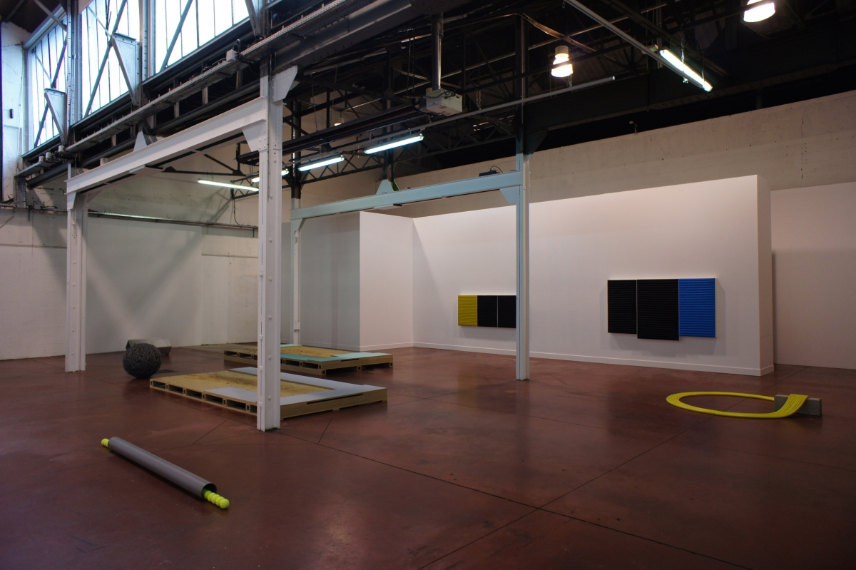 Pour ses sculptures, Nicolas Durand s’empare de matériaux du domaine du bâtiment, sous forme de débris que l‘on peut trouver dans des terrains vagues, qu’il fait dériver vers l’abstraction. Des points, lignes ou surfaces de matière colorée réalisent cette opération de monstration des formes et du volume. Leur couleur vive, fluorescente, est celle de graffitis ou d’éléments de signalisation. Pour l’exposition à la Tôlerie, il a créé un mur de parpaing, peint d’une peinture verte qui sert aux incrustations vidéo. Ce mur a ensuite été renversé dans l‘espace d‘exposition, le brisant et répandant des morceaux de ciment sur le sol de la Tôlerie. Le sens du virtuel attaché à la peinture utilisée est mis à mal par cette destruction. Le tout passe de l’ordre au chaos, redevient le concret de la matière ciment, et la couleur ponctue la forme brisée finale en nous rappelant la violence du choc auquel nous n‘avons pas assisté. L’expérience sensible est insaisissable, aussi intense semble-t-elle être. Les couleurs fluo éblouissent-elles ou nous donnent-elles à voir ? Les pièces d’Hervé Bréhier sont d’une violence toute contenue. Il a créé pour cette exposition deux socles de bois peints couleur or, sur lesquels sont disposés des panneaux plus petits de couleur bleu ciel. Le tout est conçu pour être peinture ou sculpture, avec des ajustements propres à l’art minimal. Le rythme discret de ces panneaux a résisté à une action destructrice de la surface dorée. On peut en effet y voir les traces du geste d’enroulement d’une pelote de fil de fer barbelé. Nous n’avons pas assisté non plus à ce travail de Sisyphe, mettant en danger le corps de celui qui l’a effectué. Cette pièce suinte de l’action du corps, de la temporalité mise en œuvre. L’anthropomorphisme des portes utilisées dans une autre pièce de Bréhier apparaît d’autant plus nettement. La géométrie est précise mais déforme étrangement cet objet familier. Cet «objet-carrefour» d’après Karen Tanguy, en référence à Caillois, est un nœud qui risque d’exploser de ses sens temporels multiples. L’haptique rejoint ici «le rêve cartésien des noces des idées et de la raison, qui n'est autre qu'un rêve de Présence : une vision qui s'engloutirait elle- même, qui mettrait le moi au cœur de la chose, vision haptique ou consubstantialité du sujet voyant et de l'objet vu.»3 Ce tissage de panneaux de bois et ce nœud de morceaux de portes nouent littéralement notre regard et notre psychisme à l‘œuvre. Notre regard s’enfonce virtuellement dans l’épaisseur élastique des tableaux Simili de Jean-Marie Blanchet. Leur géométrie a un rythme régulier neutre, celui du monde industriel. Mais là aussi c‘est la charge affective collective du mobilier familier qui s‘y tisse, ainsi que le souvenir du toucher du corps sur le canapé. La couleur industrielle, comme objet de consommation et de stimulation du passant au sens de Walter Benjamin, que ce soit celle du simili cuir ou la peinture écran de l‘installation de Nicolas Durand, est ici détournée pour quitter le champ de la stimulation visuelle et redevenir haptique. La pauvreté du matériau est une inscription du réel dans l‘œuvre. Le recouvrir de peinture inverse le mouvement de balancier vers le champ de la peinture et de l‘abstraction. Une matérialité prime dans l’exposition, par la peinture ou par contraste avec la peinture. A cette matérialité est associée une primarité du geste : changements de direction du muret d‘Olivier Soulerin, irrégularité primaire dans le tuyau jaune d‘une autre pièce de Nicolas Durand, échantillon comme stade premier de la couleur dans Staff de Jean-Marie Blanchet, geste d'enroulement du fil de fer chez Bréhier. Et malgré cette familiarité de la matière et des objets, on risque à tout moment un échec de la vision. Les couleurs vives, a fortiori la couleur fluo, en sont les moments de crise par excellence. «L’instinct et l’intelligence, d’abord opposés, se retrouvent en fin de compte du même côté, qui est celui de l’éblouissement, et donc d’un échec de la vision. L’instinct est éblouissement obscur, fusion haptique de l’œil et de l’objet : la connaissance instinctive est connaissance sans conscience, immédiate et «à fleur de monde»».4 Les œuvres mettent au défi de la lisibilité et de la durée face à l’éblouissement. Un combat similaire entre l’arrêt du flux des sensations par l’étrangeté des formes et la durée qui rétablit le flux de l’expérience spatiale et temporelle se joue dans les pièces d’Olivier Soulerin. La couleur plus pâle mais vivante et vibrante utilisée est la chair d’un mur, d’une géométrie zigzagante ambiguë. Mais les lignes et volumes occupent l’espace. Le temps d’observation de la couleur, pour sentir sa vibration, se couple au temps nécessaire pour parcourir l’espace de la pièce, qui nous donne à voir le lieu d’exposition et ses détails matériels. Nous sortons du moment dramatique de la destruction du mur et de l’iconoclasme du fil barbelé qui creuse le bois peint, pour recouvrer une perception d’un espace calme et non polarisé, qui se déploie doucement. En cela, la pièce d’Olivier Soulerin annonce le second volet de l’exposition-dyptique qui est présentée en ce moment.