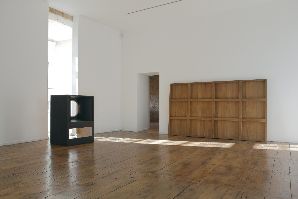 Dans la première salle, des photographies de Thomas Merret révèlent des frontières invisibles, un «infini sur le fini des mers»1. Un monochrome bleu, Coppia (1979) d’Ettore Spalletti, leur fait face. Sa moitié est présentée de l’autre côté du mur. Au centre, un banc surdimensionné de Guillaume Leblon, entre le mobilier et la sculpture. Spare time (The joke 1992-2010) (2011) de Giovanni Giaretta présente des personnages isolés sur une île déserte. Ils ponctuent l’exposition, comme pour montrer l’écart entre ce que l’on voit et ce que l’on imagine exister ailleurs et autrement. Dans Raggerra con specchi (1973) de Pistoletto, deux miroirs ouverts, surfaces de réflexion et de représentation, divisent et multiplient l’image du spectateur. L’interface est une limite, mais elle est aussi un lieu d’échanges et d’interactions. Les grands dessins de Dove Allouche, Anonyme (2011) et Charnier (2011), reprennent des photographies stéréoscopiques de l’après-guerre. Ils font écho aux peintures d’oiseaux morts de Gerald Petit. Représenter l’infini dans le fini. La sculpture toise (2011) de Clémence Torres, d’un seul trait métallique fait se rejoindre le sol et le plafond.