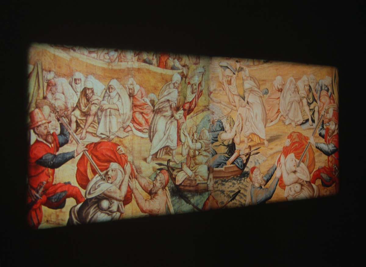 Le gigantesque pendule de Mel O’Callaghan oscille dans un mouvement aléatoire. Le temps et l’espace ont été renversés. Une image de lumière par la lumière : «le medium est le message»3. The hole of the house in the middle, 1954 -2011 de Bruno Persat, se compose de trois projections diapositives sur des panneaux noirs en équilibre. S’ils tombent, l’image disparaît. Des photographies récentes de l’artiste en noir et blanc rencontrent de manière aléatoire celles en couleur prises par son père en 1982. Elles forment un récit sans début, ni fin, où le temps s’est inversé. Sur le panneau central, un étrange «soleil vert» irradie. «Serait-ce la fonction originaire des images que de commencer avec la fin ?»4. L’exposition se termine avec une installation de Lonnie van Brummelen & Siebren de Hann. Le titre Subi dura a rudibus (2010) est un palindrome. Entre le jeu des sept erreurs et un test de Rorschach, l’image d’une tapisserie du XVe siècle et du carton ayant servi de modèle, projetées côte à côte, se rejoignent puis s'éloignent.