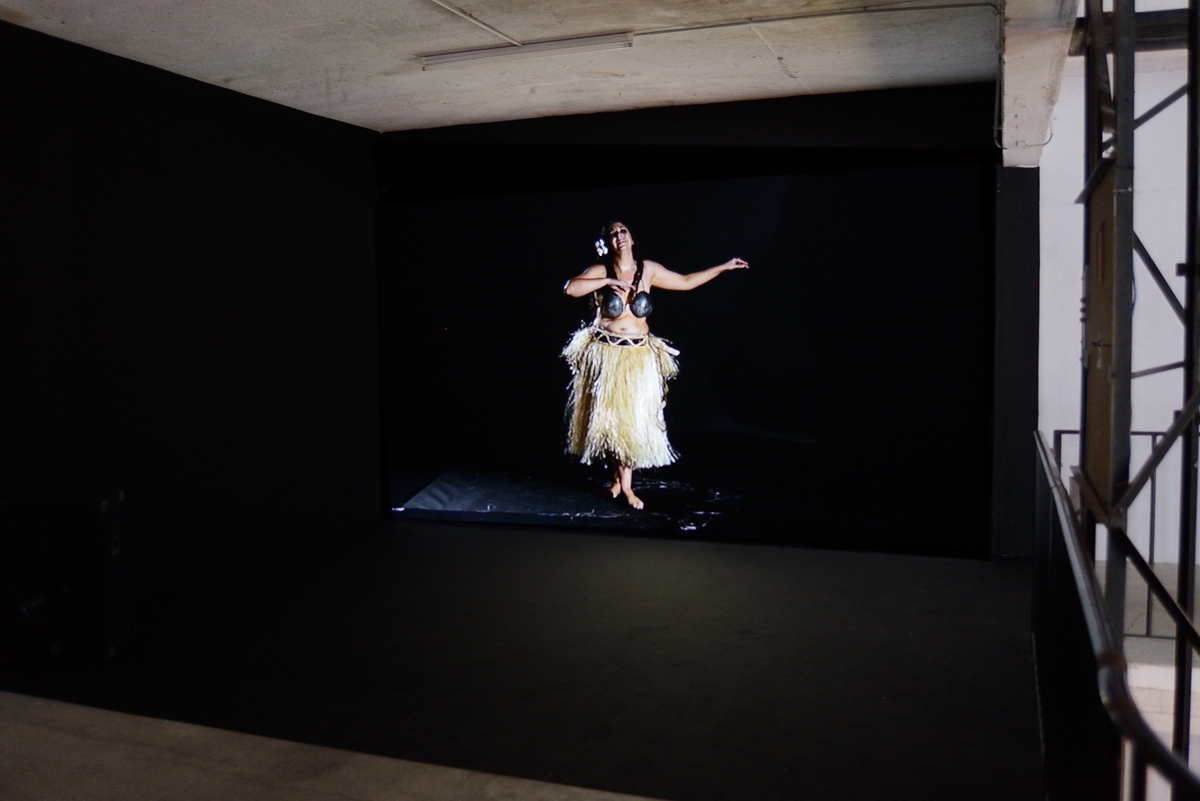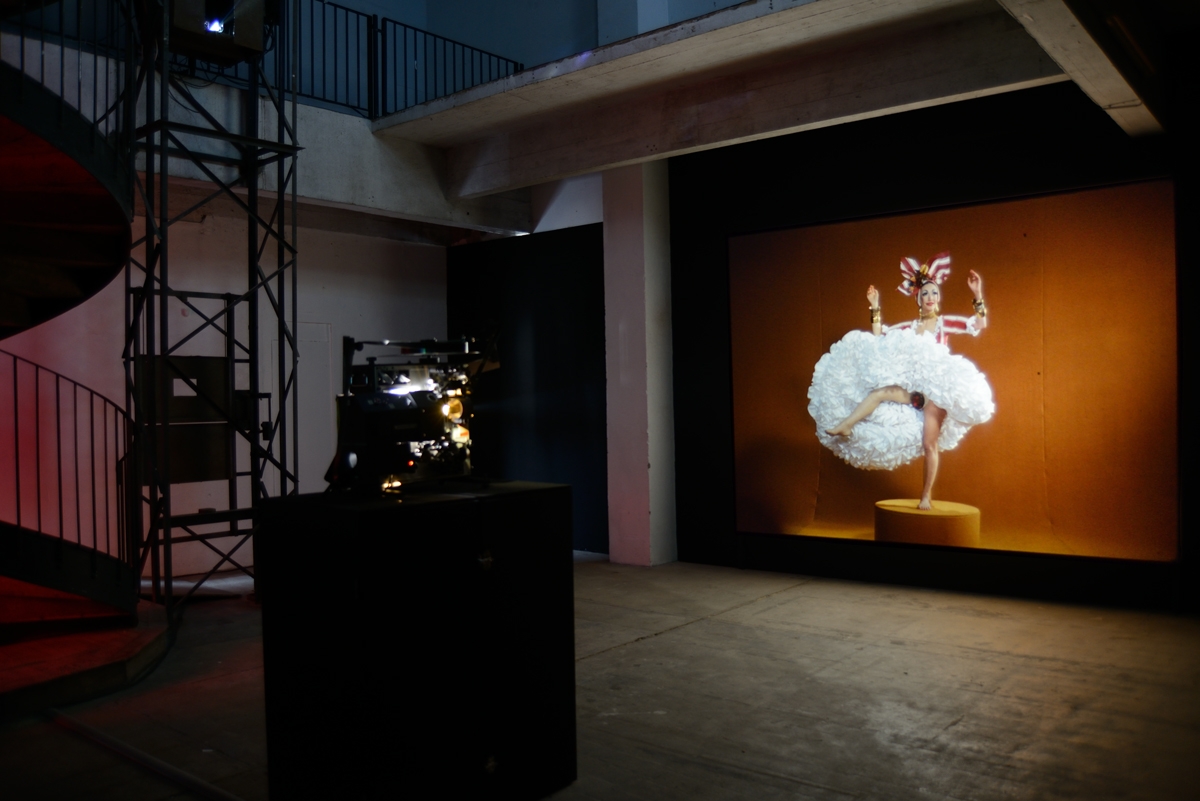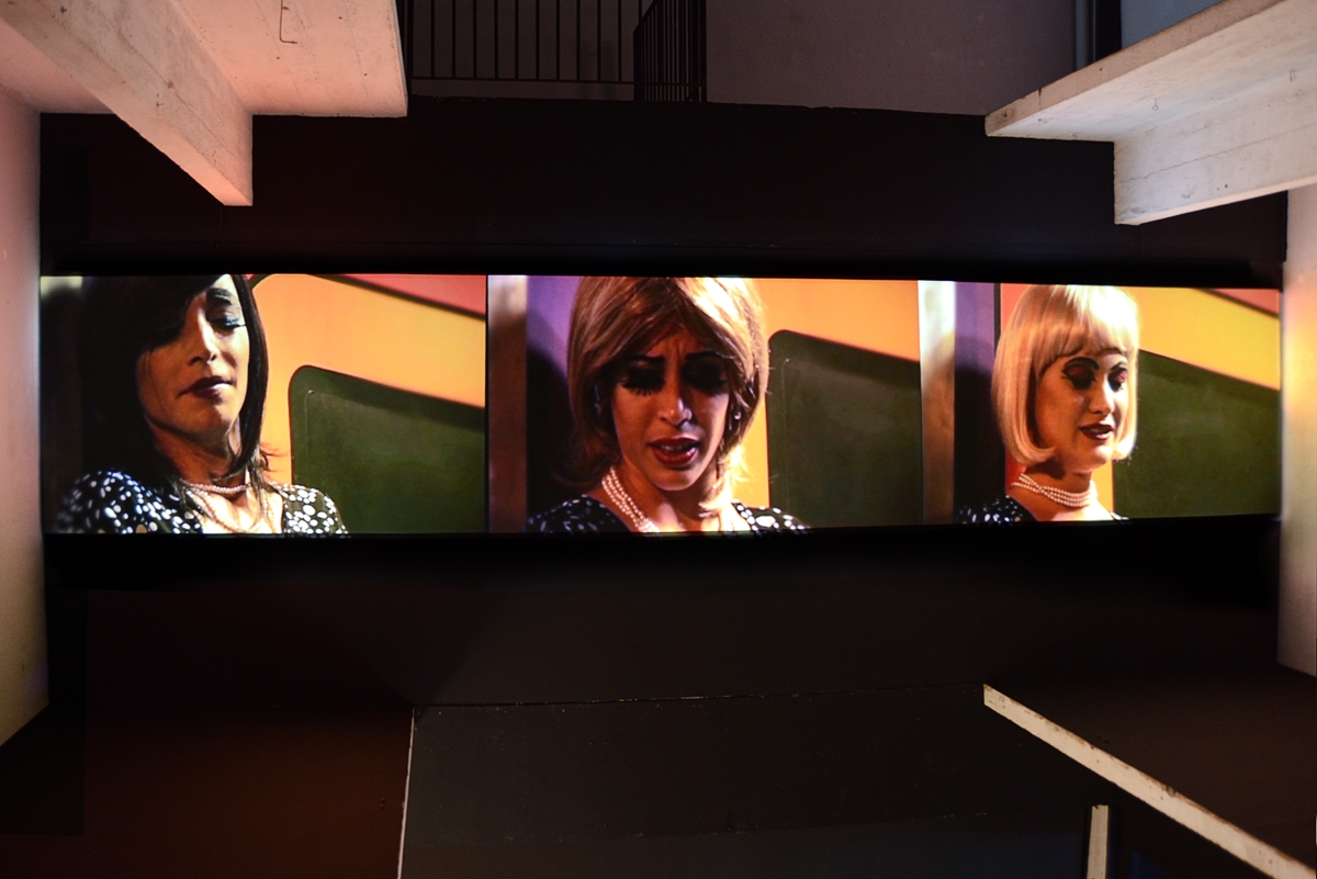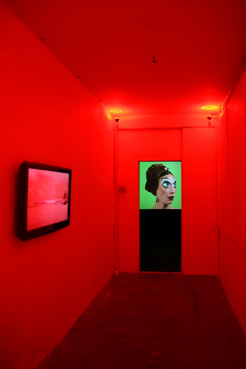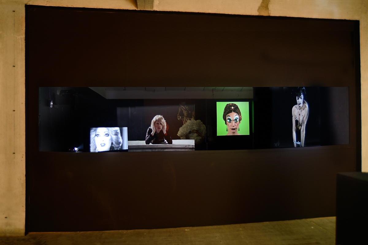 En bas, de l’autre côté du passage infrarouge, se déploient des vidéos à différentes échelles. On arrive d’abord frontalement face à un autre portrait de Carmen Miranda sur fond vert pomme. Le modèle y roule ses deux paires d’yeux, dont l’une, au troublant regard de masque, se trouve maquillée sur les paupières. Le reste de cet espace nous renvoie des images de femmes en forme de vanité, celle du Dalhia noir (Body Double 23) projetée non loin de figures issues d’une œuvre de la culture américaine underground de Kenneth Anger, Hollywood Babylon, évoquant la fin violemment fatale de stars hollywoodiennes. D’un côté une scène déstabilisante, montre, dans une mise en abyme, une actrice se mettant à nu dans un bout d’essai en vue d’un rôle dans un film, son destin tragique inscrit sur la peau comme sur la pellicule. De l’autre, des stars féminines jouées par de jeunes femmes très sophistiquées dans des poses lascives sont sublimées par une ambiance délétère enveloppée d’un morceau des Dead Can Dance rejoué par l’artiste. Elles s’offrent telles des victimes, déjà irréelles et lointaines ; et la présentation de la vidéo, projetée sur la paroi d’un petit caisson, la musique au casque, renforcent encore cet effet. Partout, l’image tend son piège comme autant de leurres, nous embarquant dans un passionnant univers trouble, troublant et fascinant.