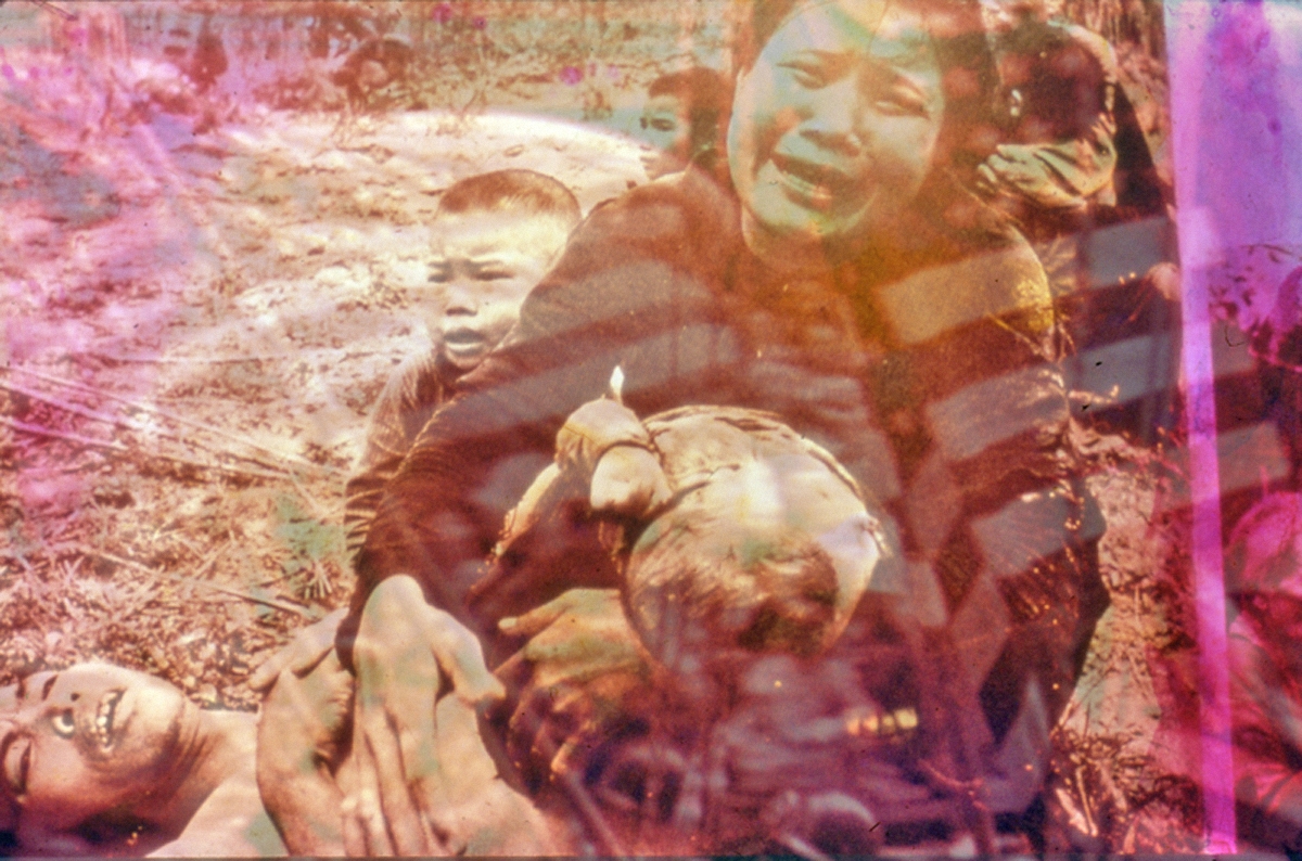 Le pacifisme de l’artiste l’amène à s’opposer à la guerre du Vietnam par la réalisation d’un film (Viet Flakes, 1965), qui est un véritable collage d’images de presse filmées, mises en mouvement, associées à un collage musical saccadé qui allie la musique pop occidentale et vietnamienne à des sons plus stridents, semblables à des réminiscences soudaines. Le film est ensuite inséré dans une performance de groupe, Snows (1967), où les corps expriment les rapports humains violents dans une ambiance de fin du monde. L’exposition de photographies retouchées par l’artiste et des dessins préparatoires vient compléter le dispositif de cette salle, qui permet de comprendre la relation étroite entre les supports utilités tout au long du processus créatif, pour évoquer un engagement face à l’histoire en train de se faire, pour expurger sa colère. Cette exposition s’inscrit d’ailleurs dans la filiation de Face à l’histoire (1996), même si elle n’est pas explicite.