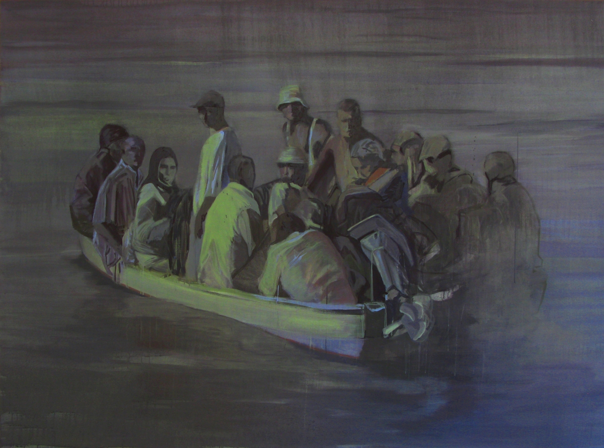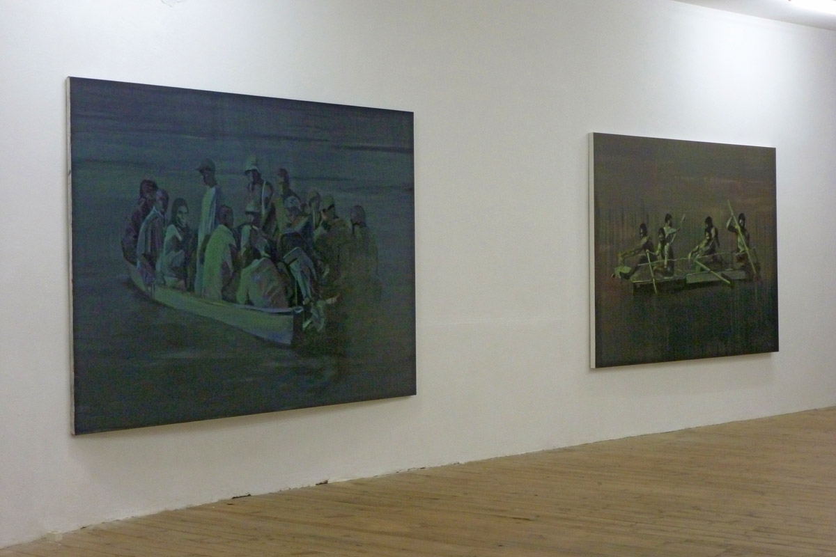 Rien d’étonnant que le regard qui s’y porte ne peut s’empêcher dès lors d’appréhender sa peinture à l’aune de nombre d’exemples, passés ou présents. C’est vouloir la faire appartenir à une famille d’esprit dont la marque est une interrogation sur l’identité et l’altérité, la présence et l’absence, la mémoire et le devenir. Pour toutes sortes de raisons, surtout analogiques, la référence à Géricault s’impose d’emblée. On ne peint pas impunément un radeau quand on est peintre sans avoir tout à la fois l’innocence et l’audace de se saisir d’un tel thème. On ne brosse pas l’image d’une embarcation chargée d’êtres humains en évidente perdition, qui plus est de l’intituler Les Solitaires, sans penser au triste sort advenu à ceux de La Méduse. On ne peint pas le visage d’un Passeur sans avoir pour modèle en tête l’une de ces nombreuses et si poignantes figures isolées, peintes en guise d’études par Théodore. Mais plus encore que l’œuvre de ce dernier, aussi fondamentale soit-elle, la série de tableaux que Claire Tabouret présente cet été au Chambon-sur-Lignon nous semble faire écho de façon quasi métaphysique au fameux tableau de Gauguin, intitulé D’où venons-nous ? Que sommes-nous ? Où allons-nous ?, daté 1897. Le triplet existentiel que pose dans son titre le peintre de Tahiti, alors qu’il se heurte à l’incompréhension de la population coloniale qui voit d’un mauvais œil son parti pris indigène, y trouve en effet une dynamique prospective. Le hiératisme de leurs figures, leur caractère d’universalité, leur paradoxal isolement alors même qu’elles font groupe et cette façon de les inscrire dans une même unité d’espace – chez elle, la mer ; chez Gauguin, la nature luxuriante de la Polynésie : tout concourt à mettre en exergue l’idée d’un être au monde et de son questionnement fondamental. Dans le rapport proprement philosophique de soi au monde extérieur, et pour tout dire du je à l’autre.