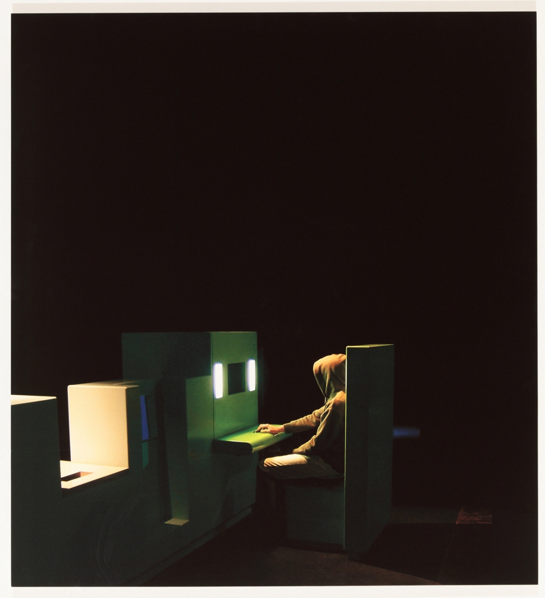 À l’entrée, l’image de la série Player (2007) de Cécile Hartmann introduit la question du corps regardant, à travers une mise en scène elliptique d’un joueur devant un écran. En écho, Labyrinth vert (2001) et Sonate pour 2 (2006-2011) de Véronique Rizzo, deux animations minimales de boules rebondissantes évoquant une esthétique désuète du jeu vidéo, se déploient dans la première travée. Entre un potentiel jeu invisible dans l’image de Cécile Hartmann et un jeu vidéo agrandi à la taille d’un tableau géométrique abstrait, le spectateur se place d’emblée dans une problématisation de son regard par rapport au contexte physique de son expérience.
