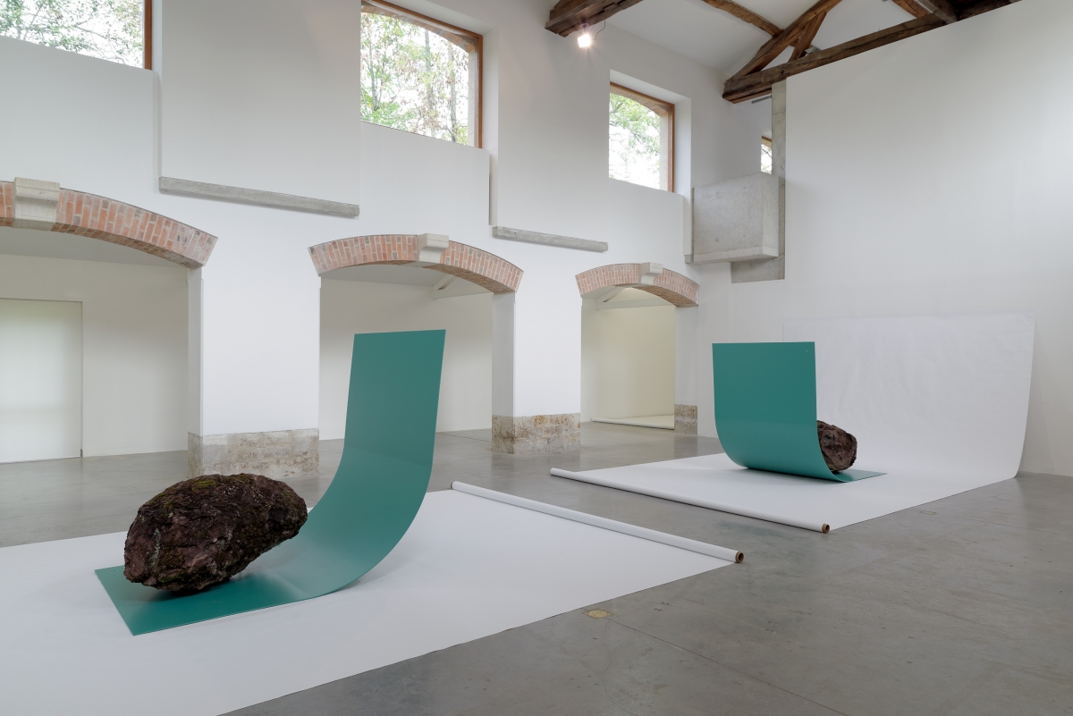 Hence the interpretation remains open, subject to potential distortions that are fully accommodated as such. There are the spectators’ divergent interpretations on the one hand, but also the ‘life of their own’ inherent to exhibition photographs. As it happens, we also often first experience an exhibition through its photographs, if not exclusively through these, derived from the press release or from a more subjective choice of visuals that illustrate press articles on the exhibition. For "bottled water branded water", we were thus largely exposed to a visual showing the work in which two stones encased a condom full of air. While certainly emblematic of the artist’s rhetoric, this image nonetheless dissimulated a part of its system, that is, the roll of white paper used by photographers in advertising, on which the artwork is placed: the exhibition photographer played along with the artist completely. While continuing to produce forms and take the risk of beauty (since it is a risk!), running counter to a certain form of contemporary nihilism of fragments and fluctuations, Gabriel Kuri’s works offer the spectator narrative markers. Yet above all, they take pains to allow the discursive path to renew itself of its own accord: between “bottled” and “branded” lies the entire ellipsis of the exhibition.
