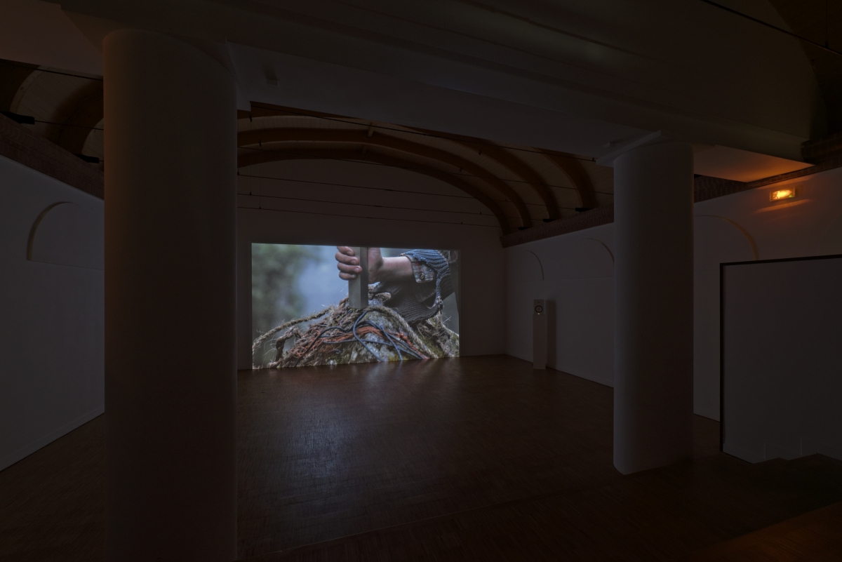 The last room, at the end of the metal bridge, launches a blind gaze into the darkness towards the dam with The Death of Ray Kurzweil (2014), to complete the circle of what opened in the lighthouse with episode 0, or vice versa. The film describes the wanderings of two characters in a tropical forest and their performance of simple, primal gestures from the history of technology: putting on clothes, weaving ropes, and constructing tools with rocks. It takes place in 2045, at the date that Kurzweil predicts as the moment of technological singularity, when artificial intelligence will be so advanced that humans will have to adapt to it. Filmed by drones, the repeated shots hinge on the sound of the clicking of the boy’s tongue and the hum of waterfalls. The film has a parodic dimension owing to resemblances with the real figure of Ray Kurzweil, and the absurd transposition of biographical elements.