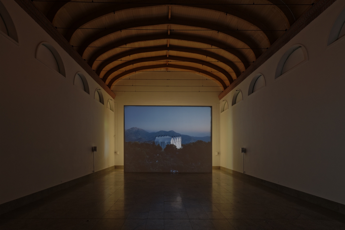 The subtext of the dialogue is duality, built up within the exhibition through a doubling-up of perspectives. In the main hall, Bassae Bassae is the double of Bassae, a short film by Jean-Daniel Pollet produced in 1964. Giraud & Siboni returned to the site to film the Temple of Apollo, perched in the Peloponnese mountains. Undergoing restoration for over 30 years, it is now covered in tarpaulins and built into an antiseismic protective structure. Owing to Greece’s economic state, the construction site has been abandoned and the protective framework itself is falling into ruins. Pollet’s poetic essay tells the story of a return to the stone of columns, of “fallen” elements, and the fleeting nature of the passage of gods among these stones. Initially narrated by Jean Negroni, the commentary is read again by his son at the entrance to the exhibition, preceding the images. Reproduced shot by shot, the remake of Bassae does not represent time with an advancing erosion of the stone, but with the erosion of the presence veiling the ruins: the work of modernism subjected to entropy. In this oblong white room, the film transferred onto film is projected towards the entrance, looking backwards, as though diverting eyes away from a veiled fascinus. With this temporal contraction, oscillating between the perspective of the landscape in architecture and architecture in the landscape, spectators anticipate the erosion of the structure under arches where they stand, dreaming in broad daylight in a Cistercian nave.