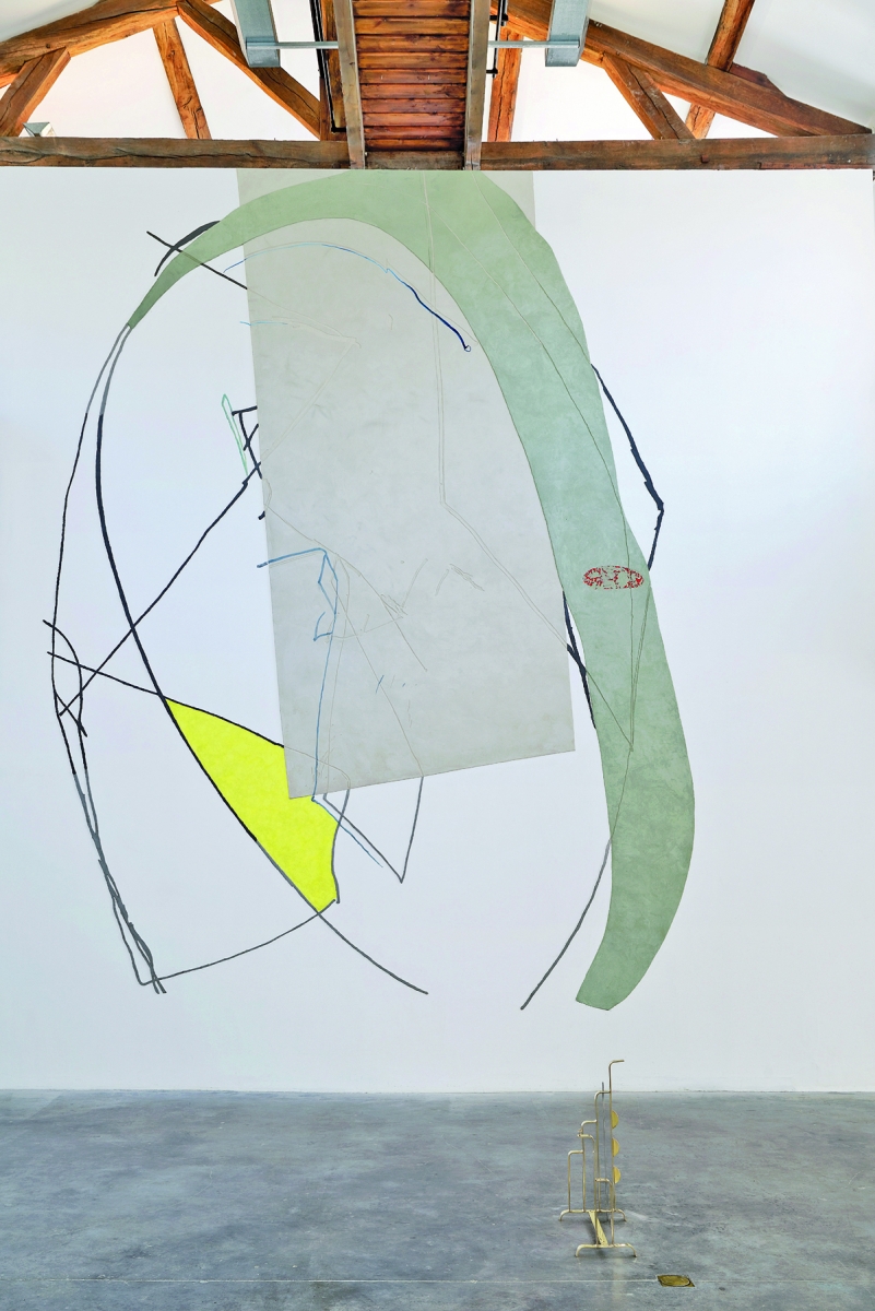 The main scene takes place in the great nave. Here sculpture and painting attain monumental formats for the first time. In the centre, a fresco and a metal sculpture oppose one another, addressing a wry smile to their counterparts erected in public space. La Fresque is produced in plaster based on a drawing by the artist, in energetic lines coated with a few large blocks of clay-toned colours. It shares a kinship with the decors of train station concourses that honoured the final hours of the modernist project, just before it came to symbolise an outmoded taste. Like the monumental sculpture taken from a drawing by Antonin Artaud entitled Totem and renamed Le Moche following this change of scale, it is put to the test of its own role, which is none other than that of embellishing the landscape. This thwarted fate (faced with which the bird with the twisted beak deploys all its efforts, by just barely managing to reach the third dimension) renders these figures moving. If there was a pitch behind these curtains hung at mid-height, it could be that of a parade which the other artworks are joining, some of them finding themselves personified through their titles, attributed by a sleight of hand (La Blonde, Le Poilu, Le Teckel). They all attempt to make a (good) impression by using all of their assets, even the least advantageous ones. Hence La Pomme de Terre, the levitating potato that claims a powerful act by serving as a counterweight to a structure in brass, foul hooked on the end of its line.