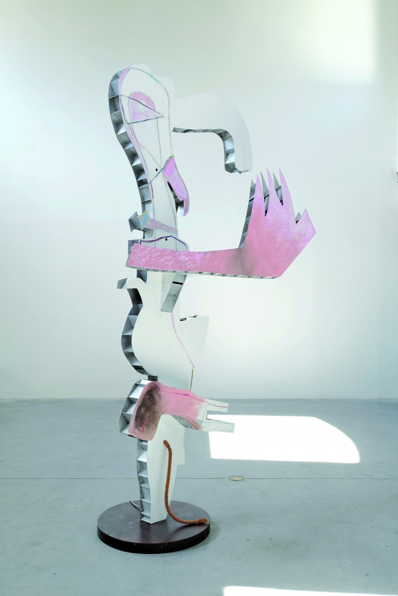 In several places the thread or rigging that ties the potato to the metalworker’s piece and escapes from the leg of the totemic bird indicates a gesture that makes no other affirmation than that of drawing dissimilarities together. The juxtapositions that Sarah Tritz makes do not articulate any dialectic or probe the status of the objects and the origin of forms. Everything is given “at face value”, preserving the energy of the encounter, especially since it’s unexpected. When she mixes the references to art history and to decorum (both have been mutually and perpetually digesting one another) in order to produce these sculptures in wrought ironwork whose design represents the hybridisation of a sculpture by Lichtenstein and the door handles of a door in her building, the artist affirms: “there is no program involved, just desires”.1 Now there is a statement resolutely liberated from the shackles of postmodern theory, in order to recover the insatiable appetite of a creative gesture nourished by its whole environment. The appropriation of objects and references in Sarah Tritz’s work has something of the “poetry of bricolage”, the do-it-yourself spirit that Claude Lévi-Strauss discusses in The Savage Mind,2 in which “[h]is universe of instruments is closed and the rules of his game are always to make do with ‘whatever is at hand’ ”, like images that stay hanging in the studio for a long time. Hence the result is “contingent [on] all the occasions there have been to renew or enrich the stock”. This supply is located in the studio as much as in the memory and consists of everything that stems from art history or the pavement, like a single given. The anthropologist also says that the poetry of bricolage resides in the fact that it “recounts” the character of its author. There is nothing but affection to be detected in the act of appropriation by the artist, who passionately copies in order to recover the original mood by way of repetition of the gesture. Rather than an address to the forefathers, it is a way of taming them, through the hand, as demonstrated by the small sculpture entitled Henri Moore, modelled in clay and brought together with thread. It is also out of tenderness that she copies Artaud’s drawing, experimenting with the resistance of the line, its fragility and energy, with the change of scale and with industrial manufacture. Also testifying to her indifference to definitions and her freedom to superpose heterogeneous gestures, the artist uses the sculpture based on Artaud’s drawing as a support for her painting. But this reconquering act is just one more attention paid to the dislocated body, which recovers its flesh colour under brushstrokes, restoring the sensuality emanating from it.