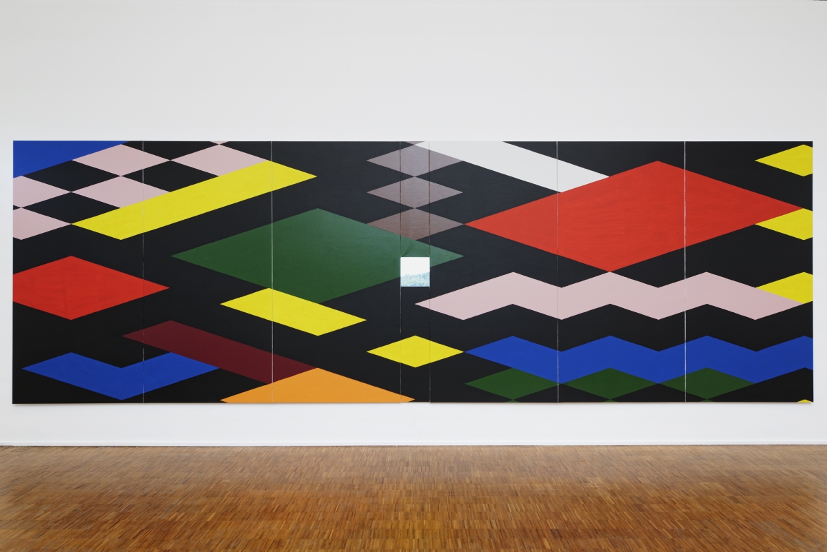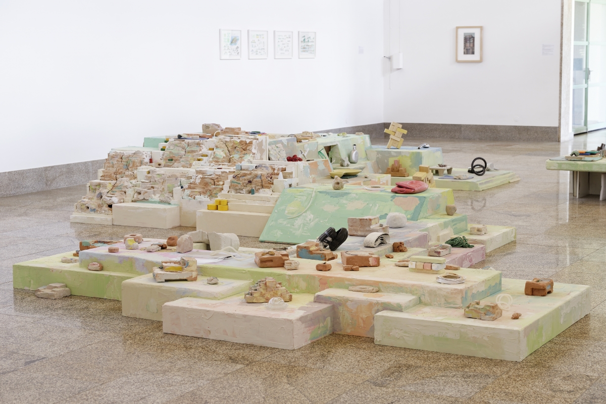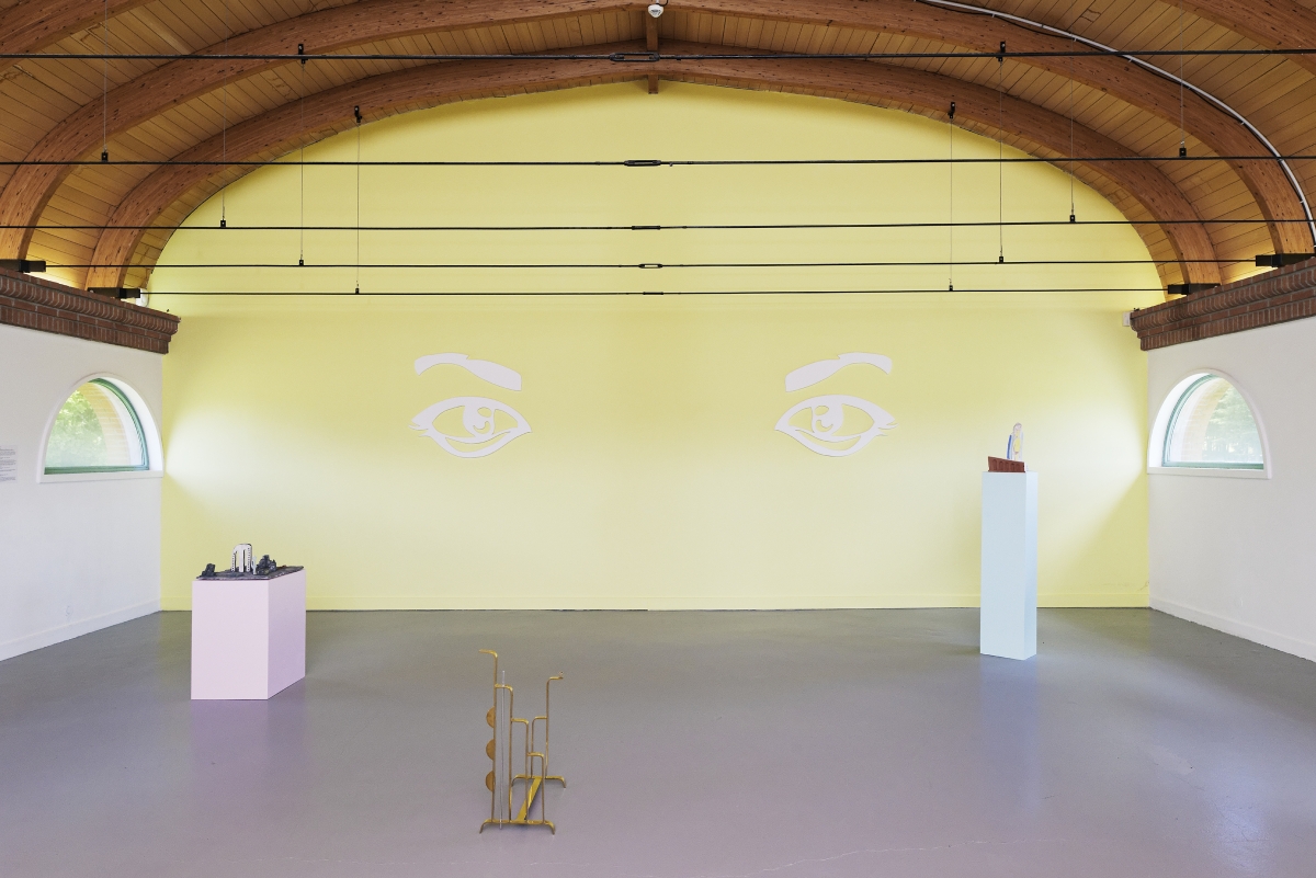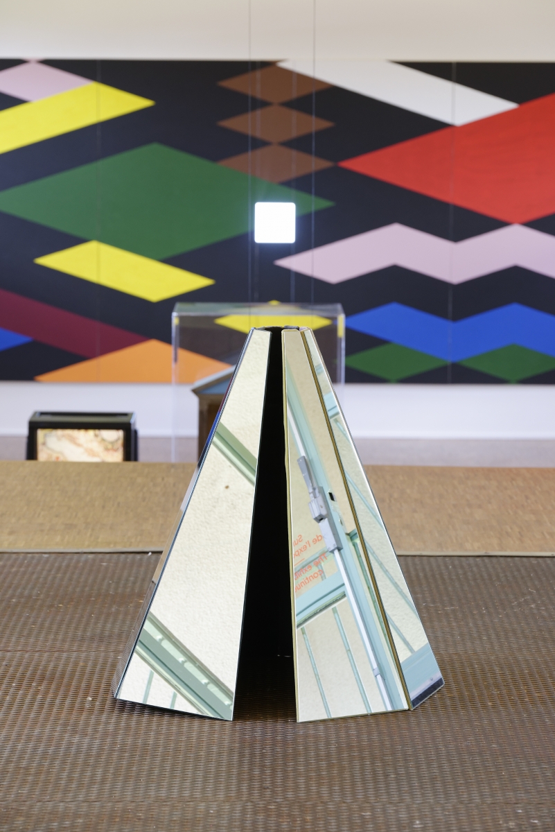 Push the door. And immediately, Lo spacio tra di noi, the space between us. Small islands form, stemming one from the other, stiff, angular, and geometric. The colours are soft, they seem light but they are rough, the meticulous organisation of the objects emitting an almost human warmth. There is a palpable desire to become microscopic, to go to live amid these forms, to live a pocket-sized life.