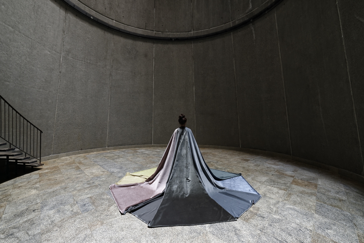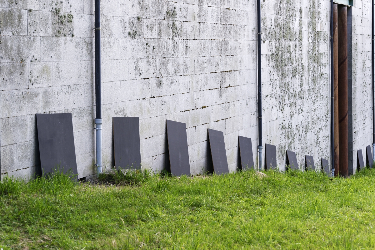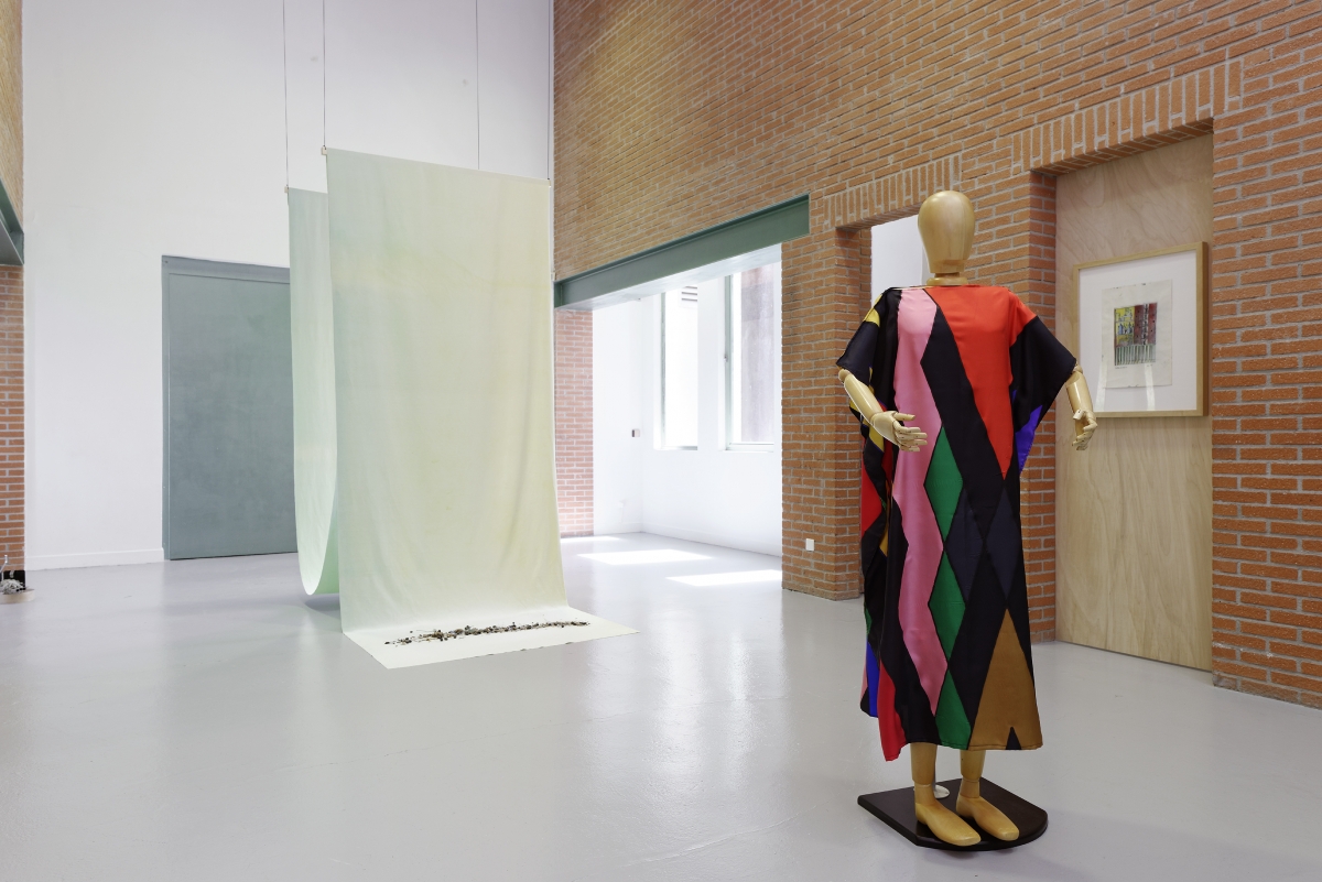 Multiple layers of sand of different colours and textures, recalling the strata of construction, the trace of initiatory rites? The sole indication of their location would be their various natures. The displacement, the erosion of time continues to be felt in a big sheet as though faded by the sun from yellow to green, animal and mineral matter is combined with small plastic balls, symbolic of a modern material, each day spewed forth by our waters. One by one, they get on all fours, as though to admire the shifting material. They think of the movements of the water, the currents that, in their flotsam, shape and absorb like a giant intestine.