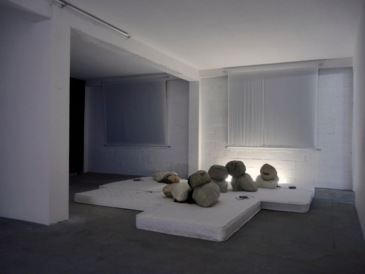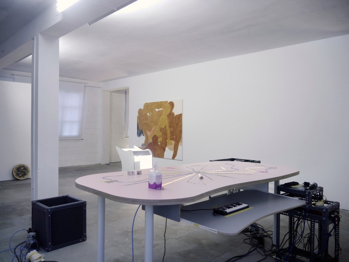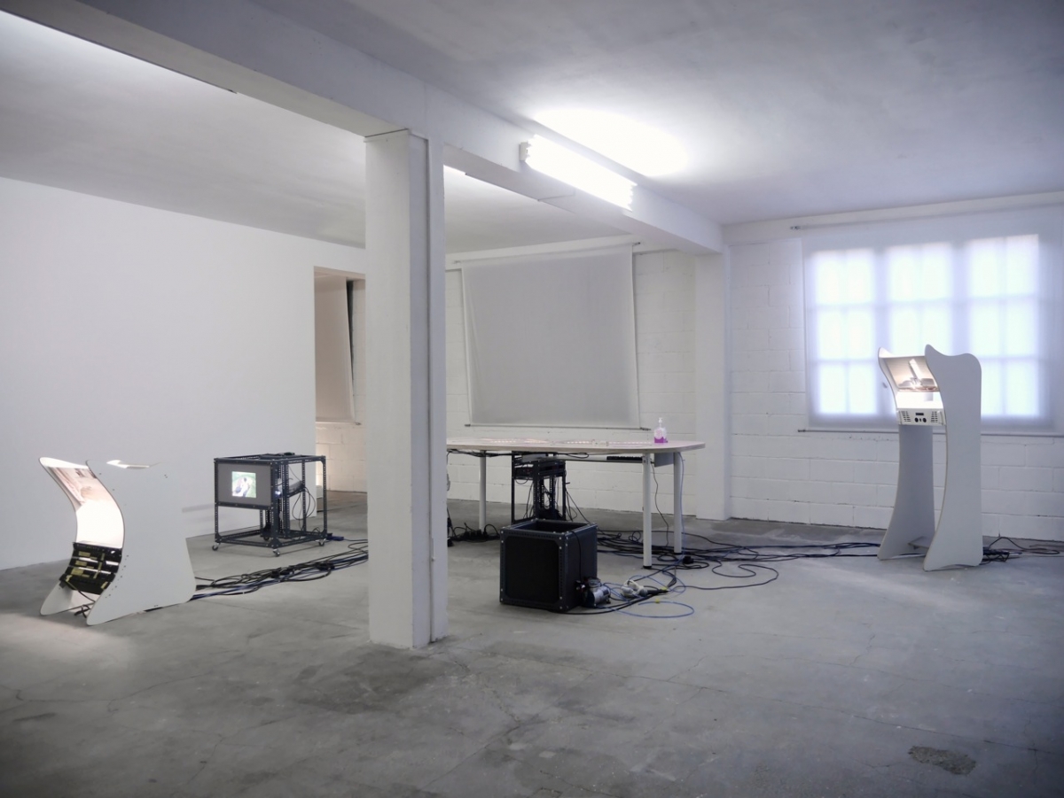 From sixties palpitations, we move on to the pulsations of Ciarán Ó Dochartaigh who performed around a seemingly enigmatic operating table. The lines of electrical circuits are drawn on the surface of a polished synthetic table. Exit points, a network of alleyways, and sensations of input and output form a strange tale in which spying and erogenous zones, surveillance and confinement, inductions and abandonments coagulate. The explicit intertitles supporting these nerve endings complete the ambivalence of the sexual charge. Added to this are objects with pins, riff-raff, and curved forms filling gaping holes: in short, a smorgasbord in the form of a Youporn Holy Trinity. This analogue table is connected to overhead projectors, discoidal modules, like the persistent subtext of a restrained gay night out clubbing. The signal has difficulty getting through; intermittent beats punctuate the brief appearances of a building with fluid architecture. We learn that it is located in Saudi Arabia. Triumphant, utterly phallic, its authoritarian gaze does not authorise the fluidity of genders, desires, and identities. Susan Sontag’s erotics of form meet the ayatollahs of cyberporn.