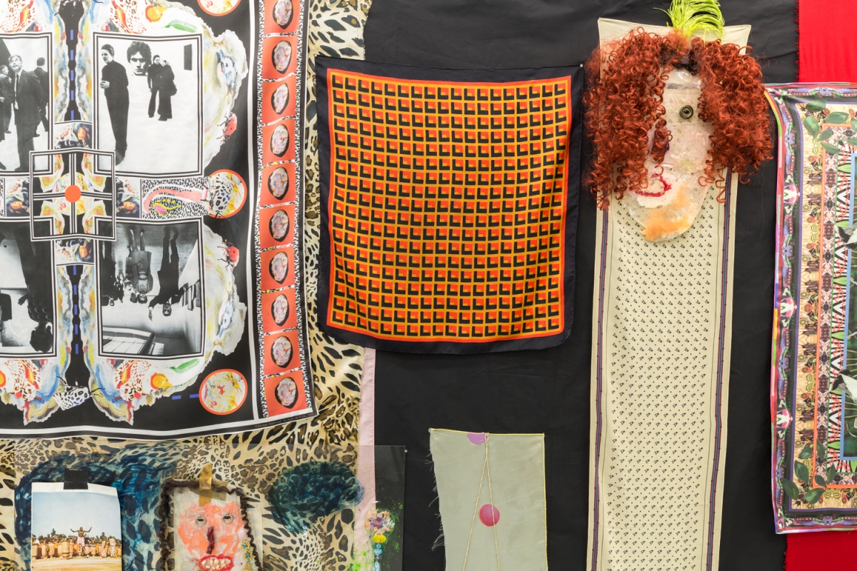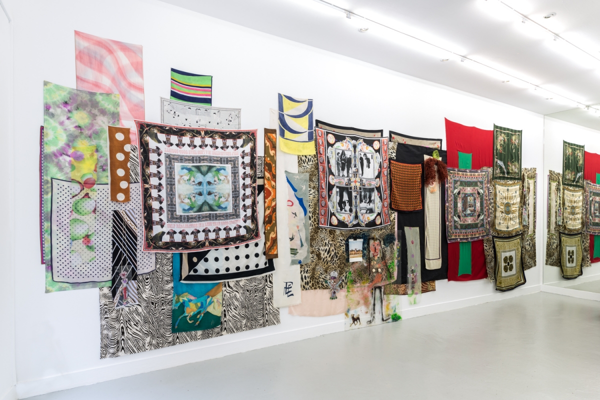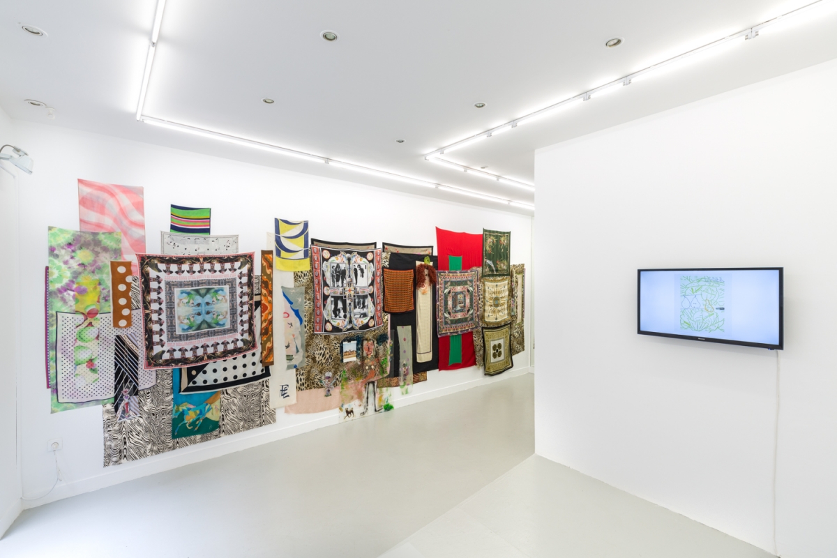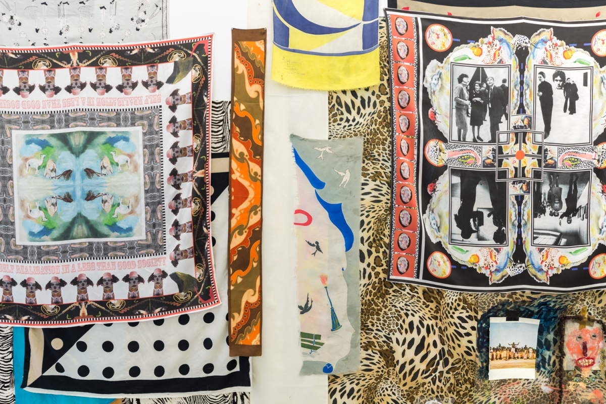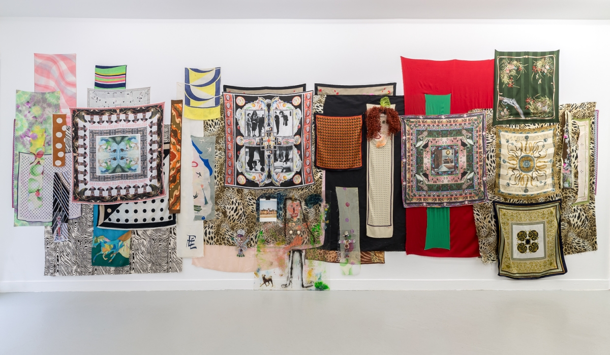 GR-W: We keep coming back to thinking about the way of wearing/carrying/conveying, and therefore, of presenting. In Le bien, voir(e) le très bien, you presented two works, one of which was a series of scarves that partially reworked your paintings and archive images by André Morain, scenes from exhibition openings in the 1970s; and further along there was the slideshow The Biggest Painting Show Ever, one thousand paintings since 1900... Plus one of your own. Can you tell me about your connection to the exhibition?
