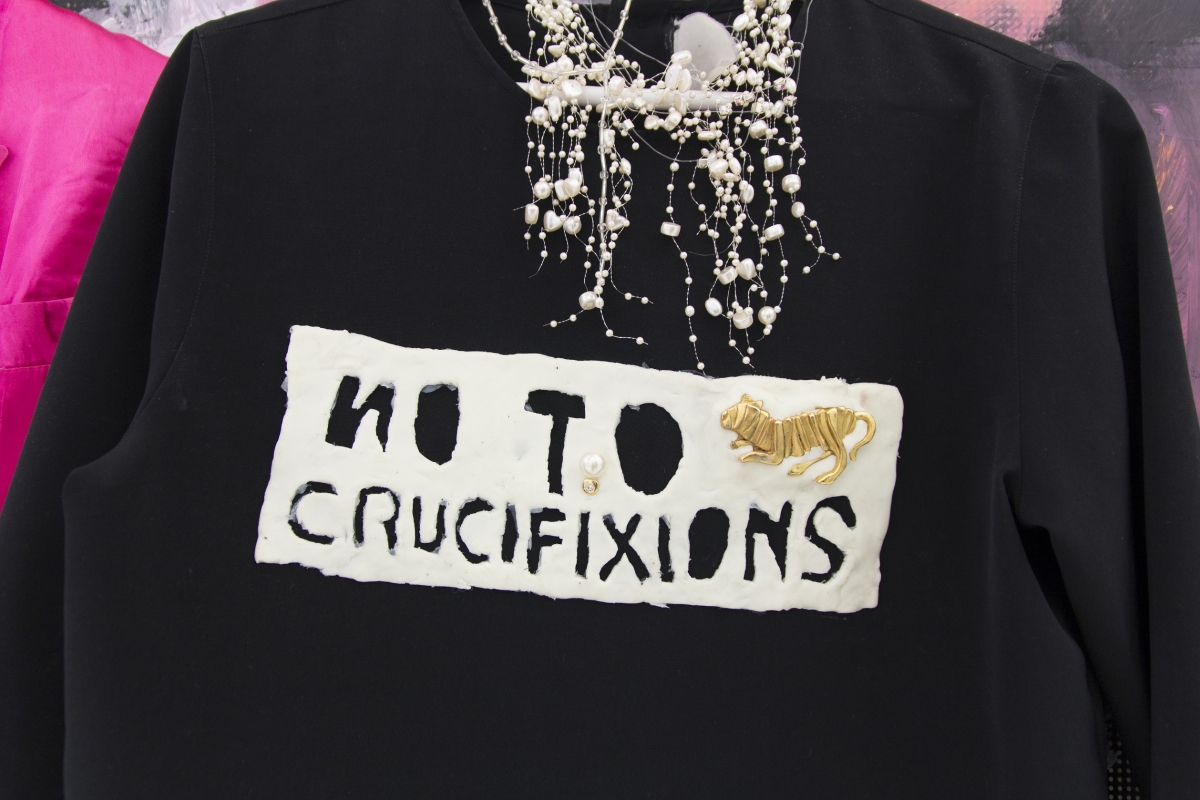 Fabienne Audéoud: Considering the word as a virus implies the idea that it “colonises” everything. From tins of food to bottles of wine, from sweaters to handbags: everything “speaks”. “It” is addressed to those who read, who consume, and those who carry these words, these phrases. The Good operates as a kind of condensed version of this kind of statement (about clothes, food, advertising, etc.) whereas the “No To Crucifixions”, which is embroidered on certain pieces, reverses the moral of pendants bearing a cross, an instrument of torture. In this, we can read a reference to both biblical notions of “the Word made flesh” in Genesis and the “sign of the beast” from the Apocalypse expressed through wearable items, as is the case for many contemporary clothing brands or objects.