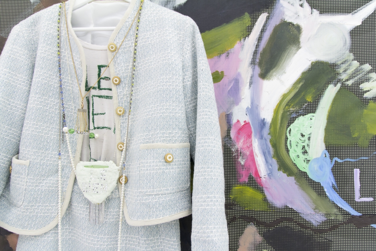 Georgia René-Worms: Fabienne, I’d like us to reflect on this exhibition that you presented at La Salle de bains, a foray into what these three rooms represented: Le bien [Good], Le bien… ou pas [Good... or Not], Le bien, voir(e) le très bien… [Good, or even (see) very good...]. Starting with a semantic line of thought, you considered the word a virus that is both moral and visual, a positivist social injunction that even slips into our wardrobes. It seems to me that you position yourself more within a liminal space to explore a certain pleasure relating to taste and objects, in an attempt to hold yourself as far as possible away from a position of judgement. In your most recent works, we encounter a community of ghostly women who inhabit the exhibition, where fashionable clothing and accessories become a statement, a kind of embodied expression. Can you tell me about this idea of embodiment?
