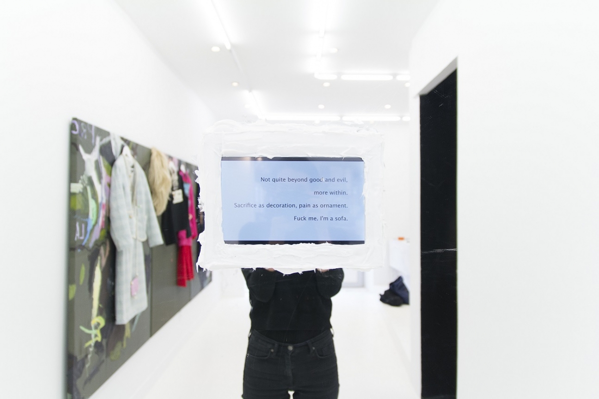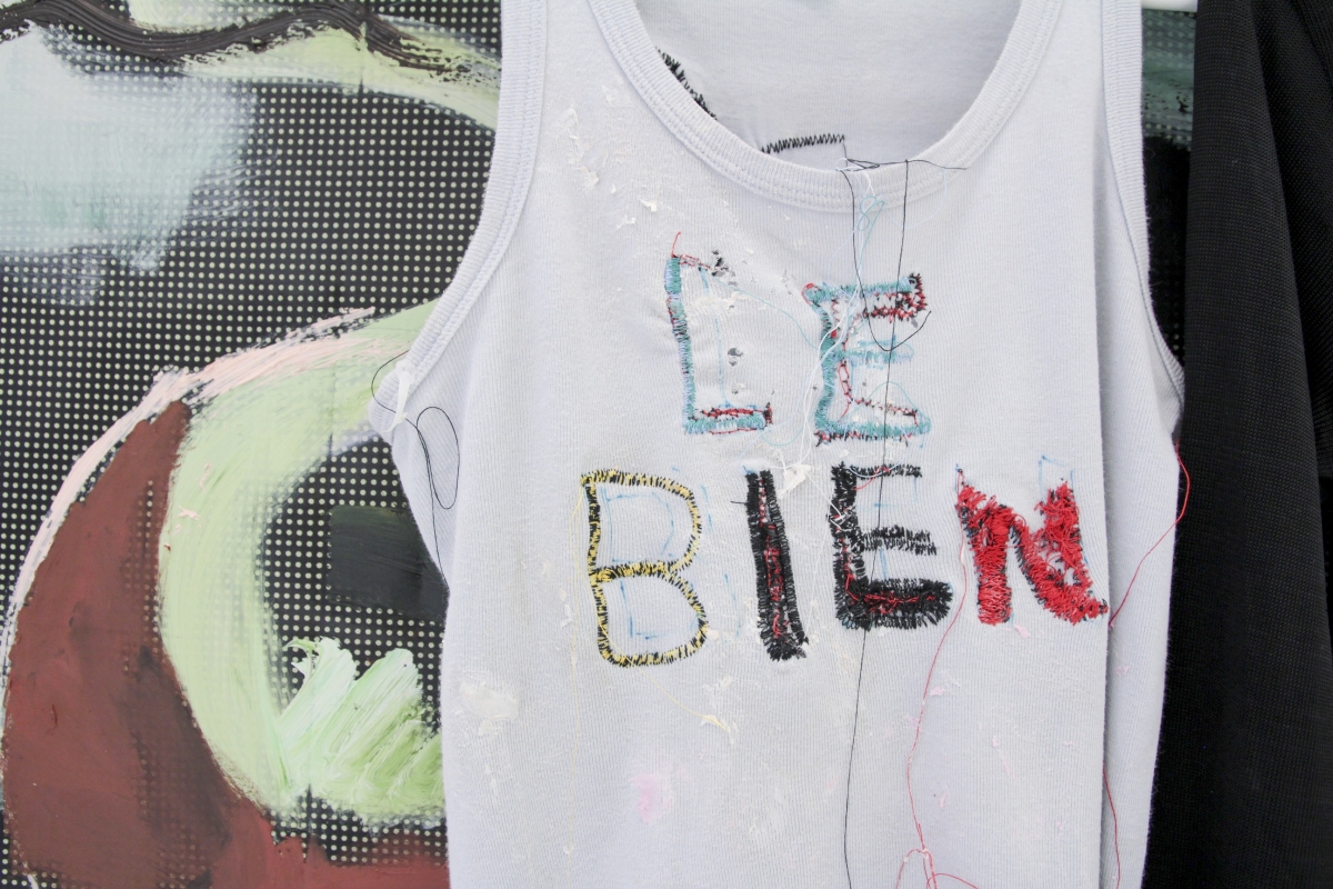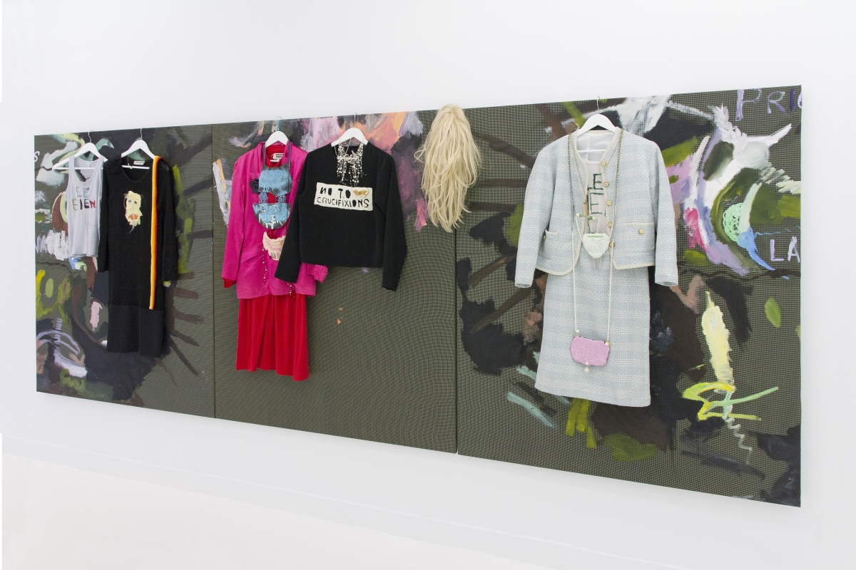 FA: My position as an artist is often that of a musician: I play something, a gesture, an action. I take responsibility for what I’m “playing”. Wearing, carrying, conveying is not presenting, it’s taking responsibility for your discourse. La Salle de bains and I didn’t always agree on that score... I don’t know what there is to see, so I can only offer my chosen position (like in a religion). Above all, I don’t want to show what “I know”. The idea is more to create an effect, an effect of visual pleasure that corresponds to vulnerability, to an attempt (which for me often ends in failure), to understand, speak, paint, dance, or cry.