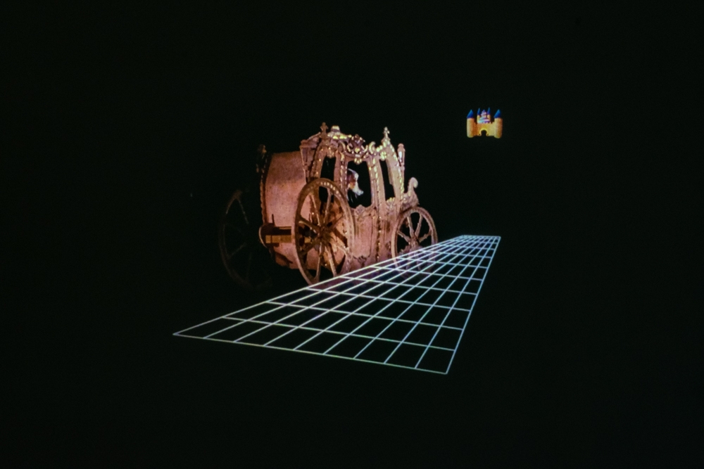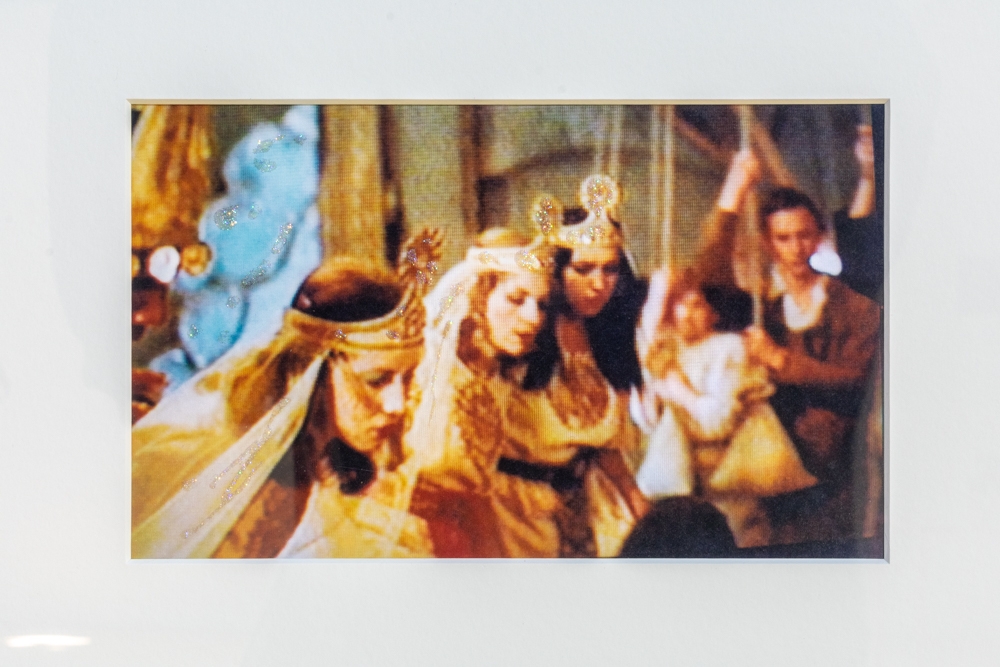 As its statement presents it, Garland aims to be polysemic: it is clearly the principle of the garland that is initially convoked, or more specifically, the fact of assembling various objects or ideas – a mise en abyme of the exercise of collective exhibition – but also different realities, with the goal of confronting them. The model of the fairytale thus becomes an appropriate tool for analysis, and if we’re talking [Judy] Garland, we’re also talking The Wizard of Oz (1939), the ultimate film-landscape. A purely studio-based production, featuring sets with painted landscapes, whose planarity still works as a perfect illusion, this film does seem to be the perfect model for both the formal and conceptual structure of Garland. The yellow colour of the original floor of the exhibition room is still parsimoniously present, echoing the yellow brick road of the film and the four wallpapers by Alex Da Corte very faithfully reproduce the colour code of the landscapes in which the actors roam. The very glittery atmosphere of the film gleams in the works of Karen Klimnik, Guendalina Cerruti, Signe Rose, or Scott Benzel, while princesses and fairies appear throughout the visit as in Ericka Beckmann’s Cinderella (1985) that we still regret was not projected to human scale as the artist recommends.2 A choice that was all the more surprising in that the exhibition invites a complete corporeal immersion within a specific world… The filmic illusion is brought back to the visitor’s attention with another artist of the Picture Generation, Sherrie Levine, whose presence recalls the principle of simulacra at work in the culture of the consumer society, active now more than ever, and confirmed precisely by most of the artefacts used in the artworks exhibited. But it is also the angelenos origin of most of the artists listed that completes the importance given here to the filmic illusion now at work in reality: because if the sublimation or mystification of the banal now seems to go without saying, there is no longer any difference between reality and fiction, an established fact that pop culture has largely contributed to provoking.