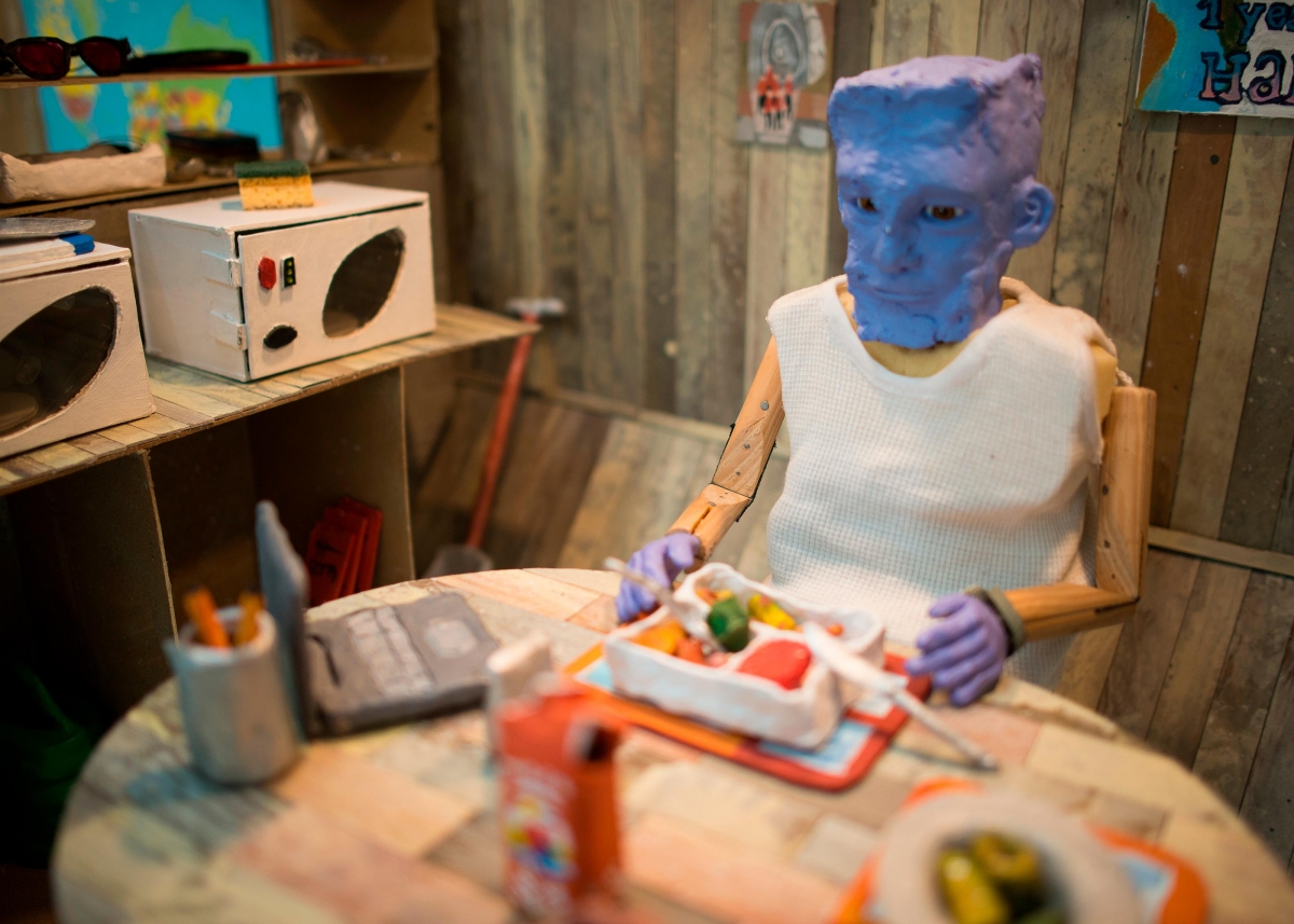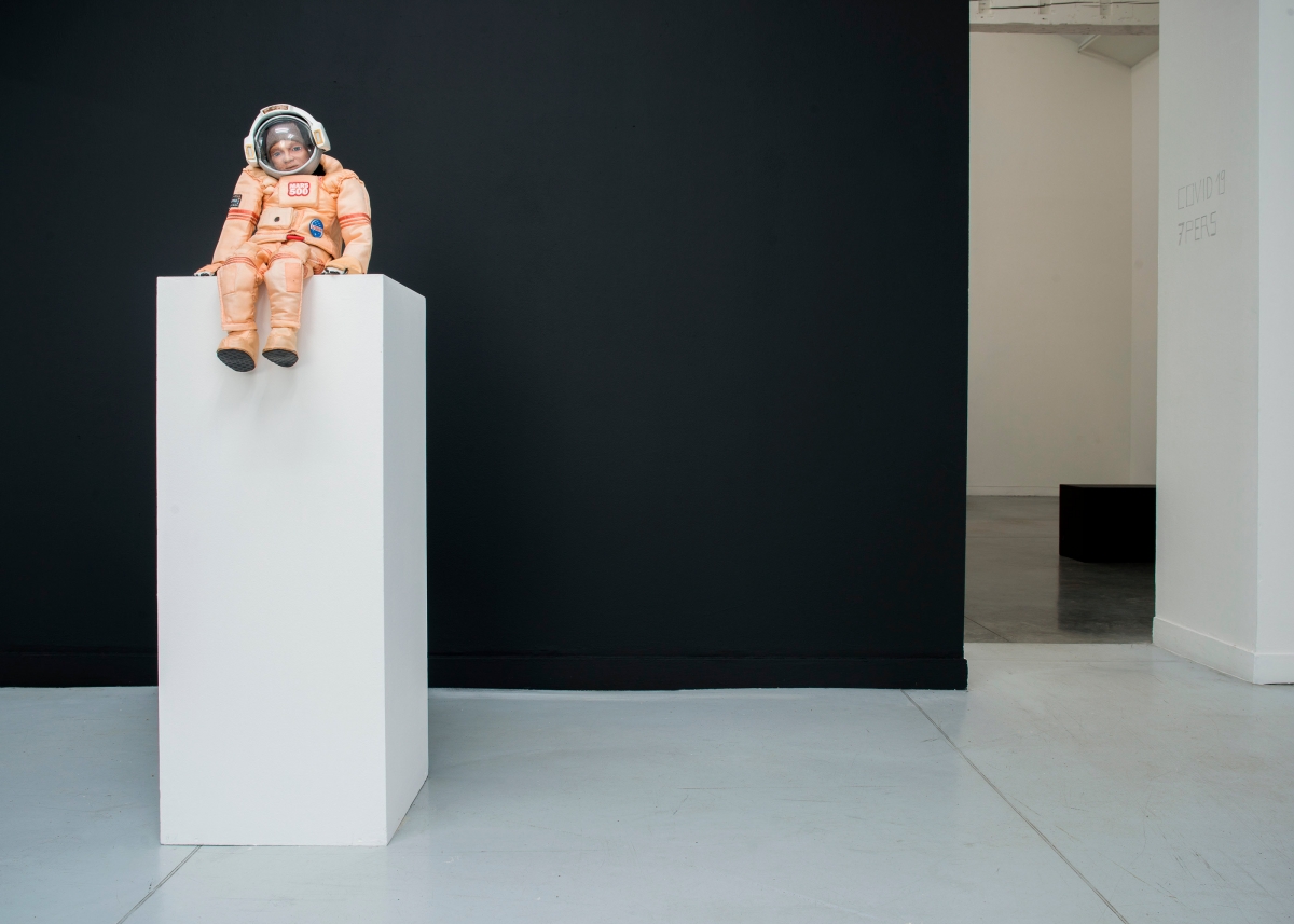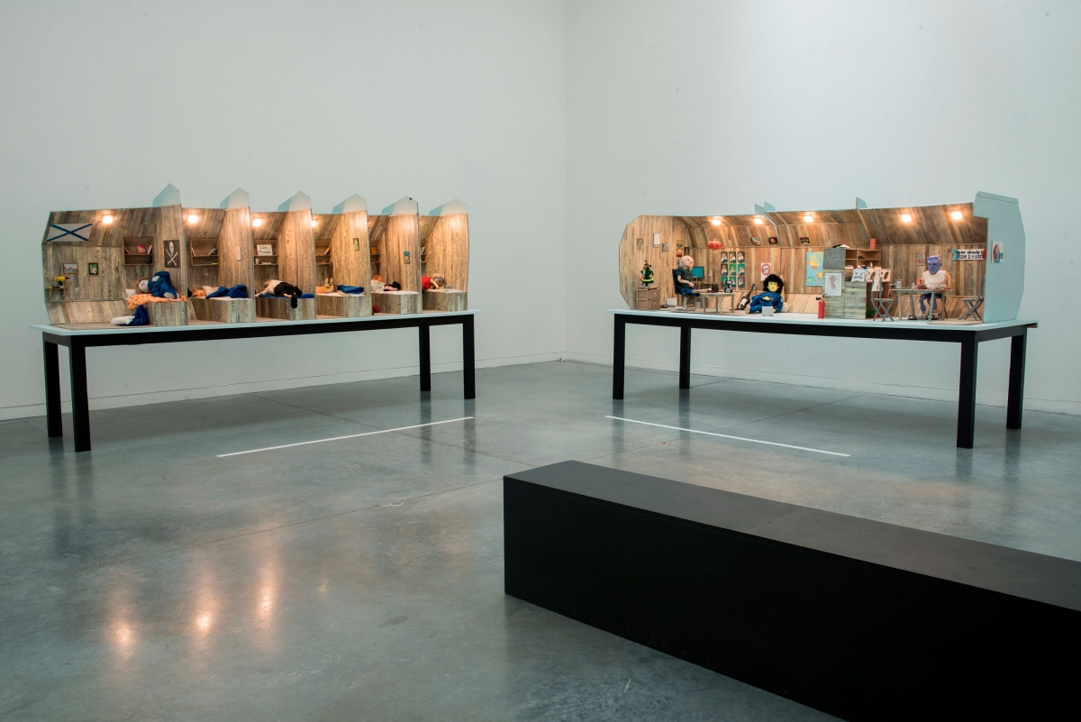 Like a clue to the shifts he promotes, the “heart” of the exhibition is not placed at its centre. The work En attendant Mars, often seen and commented upon, occupies the main room. It includes both the physical installation with its lethargic marionettes in their cardboard world, and the film in which these half-objects (because) half-post-humans, find themselves infused with a precarious form of life, thanks to the use of strings. Relegated to a corner, on its retro monitor, the film gives the impressions of being less alive than the “real” marionettes, with the playful, repressed impulses that they elicit. It becomes part and parcel of this fake decor, and is almost inanimate, like the rest, owing to this mise-en-abyme.