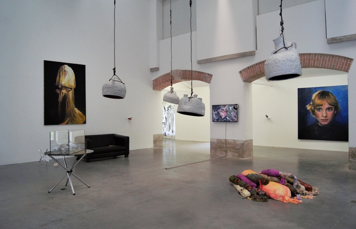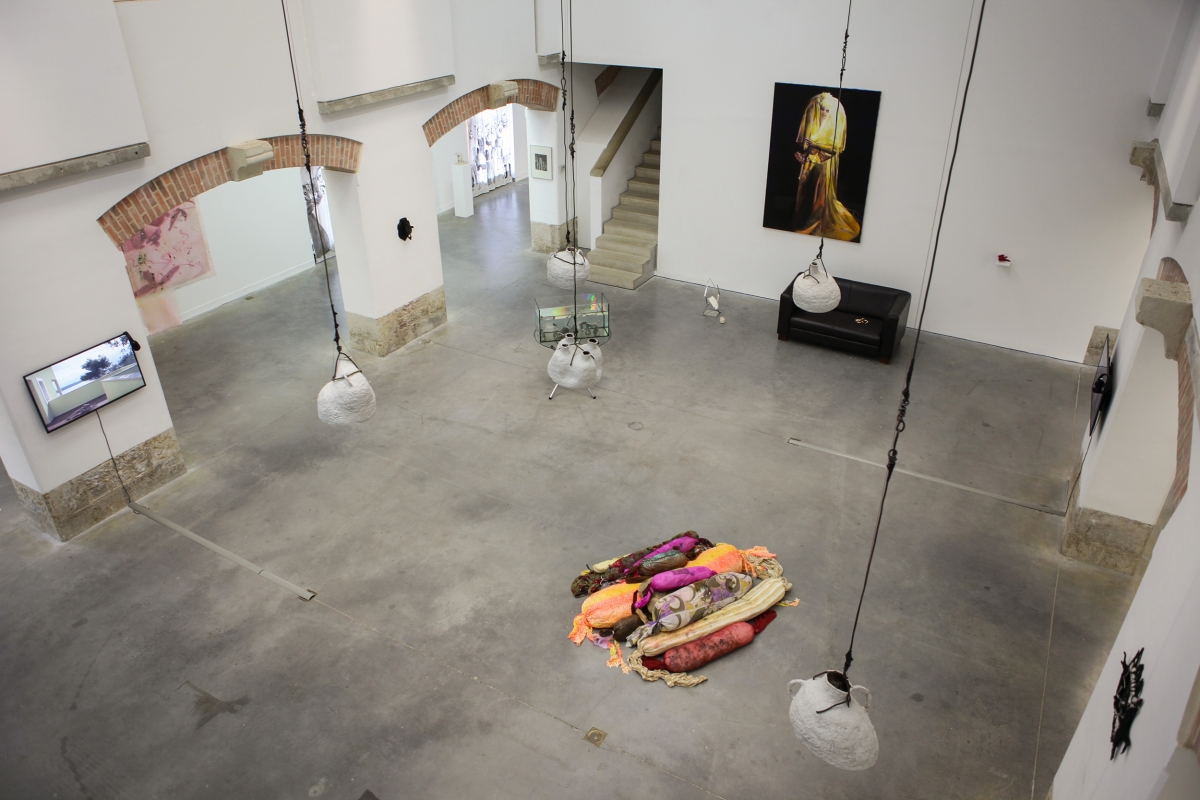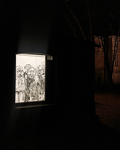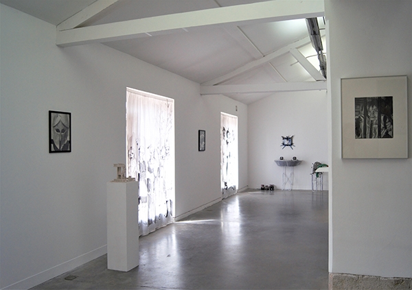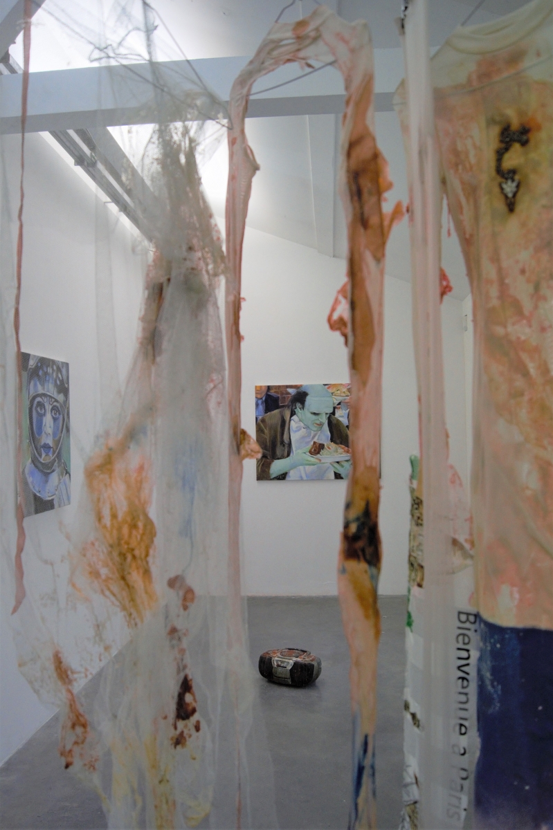 Behind the fields, Pougues-les-Eaux is a testament to the faded glory of what was once a spa town. Its houses evoke the burgeoning bourgeoisie of 1900 and its taste for pavilions and tree-lined parks. In the heart of this village, reigns the Parc Saint Léger art centre. Perhaps it was this dated casino atmosphere that was the inroad for the exhibition Fun House by curator Cristina Ricupero, revisiting the sombre hours of amusement parks with largesse, but that’s not all… The exhibition room is haunted and the artworks tinged with horrific, terrific, or phantasmagorical references. Its organisation stems from desolate, haunting narratives told in fits and starts, like the ‘jump-scares’ that delight fans of horror films. Firstly, we note the soundtrack designed by film critic Thierry Jousse, which wreathes the space in an unsettling atmosphere based on giallo synthesisers and dissonant notes, contributing to the dramatisation effects that all of the participants enjoy. Then we are introduced to Anna Solal, by way of a bathroom, reconstructed using urban waste, the stumps of sneakers and iPad debris. The walls of her sculptures are sewn together with a teetering and sometimes grimacing elegance, when they are adorned with the Gucci trademark. Is this a site of ablutions? A place to cleanse our wounds? It calls to mind Robert Gober, Louise Bourgeois, but through its refusal of solemnity, a concrete humility marked by the labour of cities, the artworks appear divorced from a kind of sentimentalism. Further on, characters with shadowy contours cover the many slit windows. They are Oscar Chan Yik Long’s painted curtains, reproducing the degenerating silhouettes from Carpenter’s film Prince of Darkness.