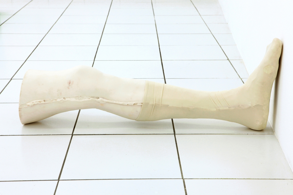 The body parts appear male, but play on their ambiguity. The casts of the three members, two legs clenched tight, dissimulating their phallus, are titled Alexa: the diminutive amputates a name from its final syllables, which often determine the gender. The hips of a sawn-off asexual model mates with a jerrycan. In the video excerpt, captured by the artist, on the website Boyself.com, the sexual, androgynous, and prostrate worker exposes his hairless back, long hair, narrow hips, and buttocks, with a dildo sticking out of his anus. But he hides his face and does not show his genitals.
