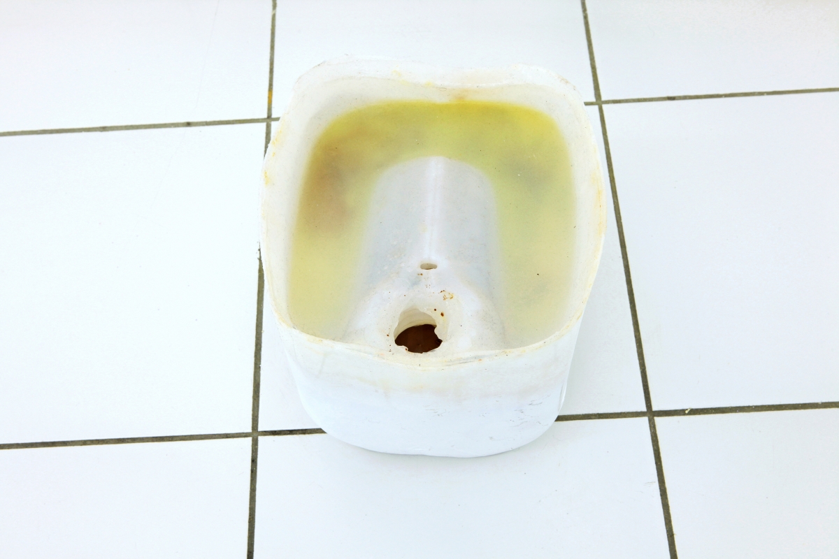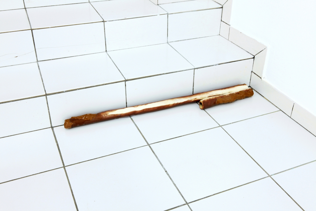Descend into this pool. Discover a tube against a step, covered with a silicone cap the colour of fecal matter. Homemade brioches, monstruous yeast, stuffed into the pre-existing niche in the ceiling. Decipher the lewd subtitles of a tiny video screening. Solitary, cold, rigid, and white handfuls, moulded to the shape of the palm of a hand.