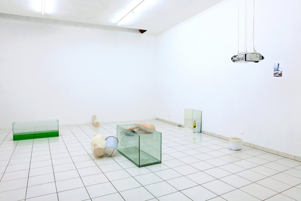 The first view is from a high angle. The space, three steps below, evokes a dried up pool. Various casts of the lower part of a body, objects, and assemblages arranged on the floor are reflected there, behind a dirty aquarium, or juxtaposed. There is an unusual correspondence between height and volumetry.