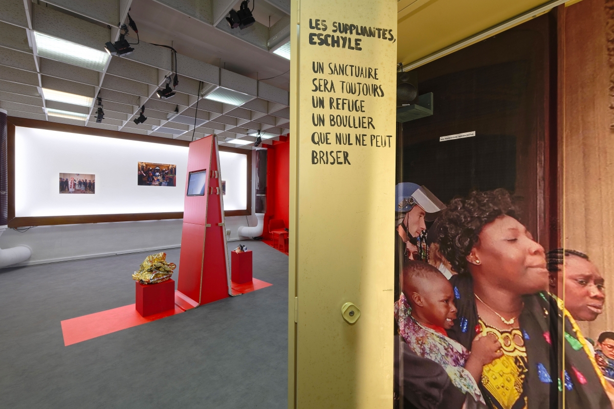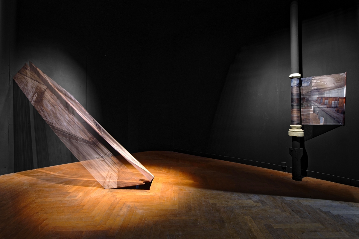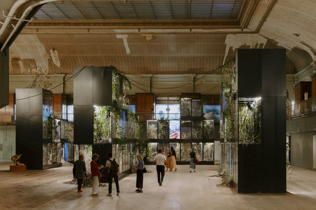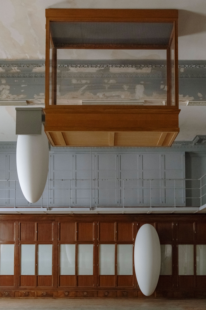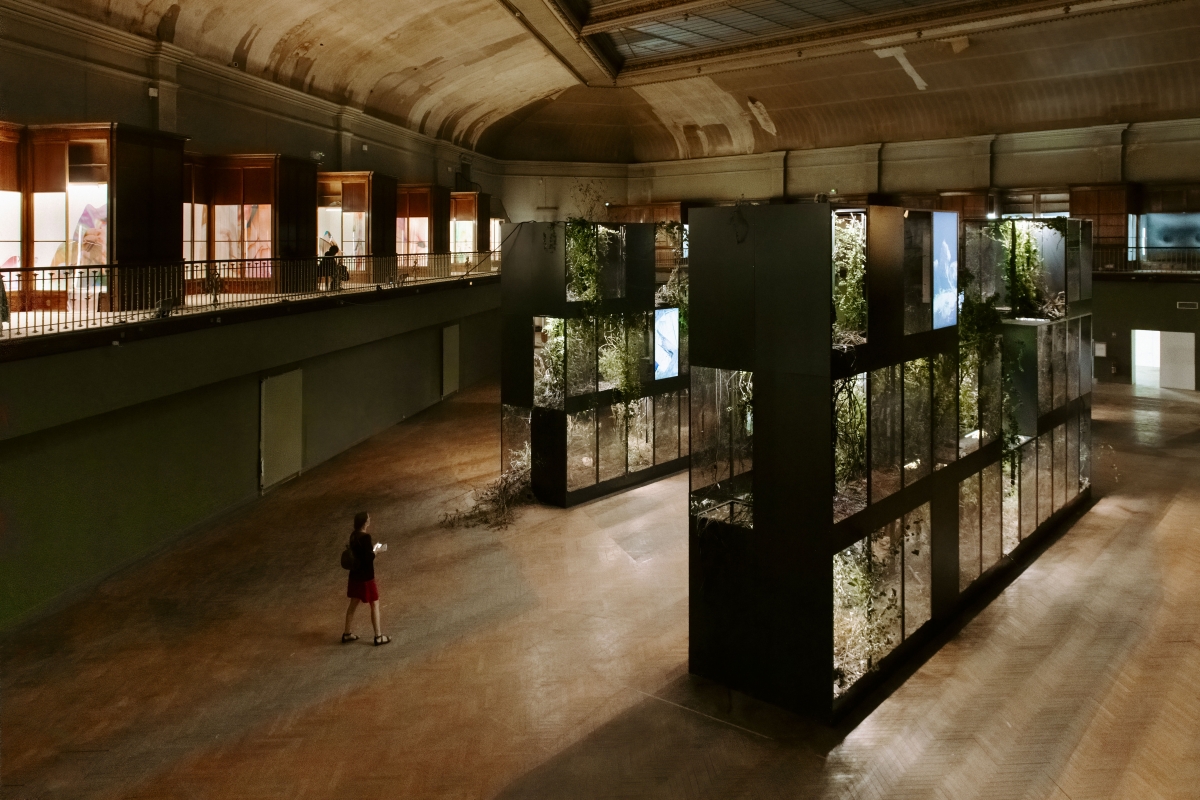 In this edition, a site appears as a literal manifestation of fragility: the former Guimet Musem of Natural History which has been closed and abandoned since 2007. Having opened its doors yet again for the first time since its closure, the now empty museum hosts works and installations proposed by invited artists. A dialogue with such a space seems difficult to develop without physically seizing the space, or of its furniture, for example, as seen with artist Tarik Kiswanson who suspended original furniture surmounted by immense oblong sculptures from the ceiling. Or wooden display cases that have become exhibition spaces for Lucile Boiron or Zhang Yunyao. But the strong presence of the site prevails, evoking the imaginary of the ruin, as with Leyla Cárdenas’s installation Self-contained Withstander that makes the museum reappear through photographs printed on wire. This image of the fragile museum can be found in several places in the biennale, with the presence of archaeological remains, casts and damaged paintings. And is it possible to compete with a museum bypassing the spectacular? At Guimet, it is in the heart of the impressive central hall that stands the equally monumental installation Grafted Memory System by Ugo Schiavi.
