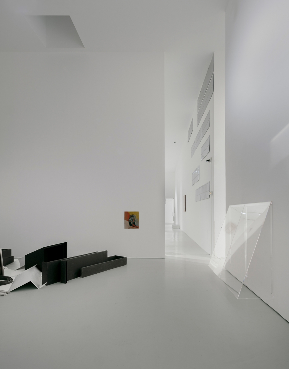 If I keep referring to this final, grand finale room, it is because I was anticipating it without knowing it. In room 5, we discover the (wo)man-behind-the-curtain moment, the backstage, or the archives and storage room which itself is a recognized oeuvre, Untitled (2022). From this room of materials that Djordjadze has continually worked with – including foam, gridded furniture, glass forms, wood, plaster, carpeting, aluminum, steel, bricks, plexiglass, older paintings and framed works – the spectator can imagine the artist making aller-retours and throwing more materials in the assemblage, watching it grow. Or making the aller-retours and taking stuff from piles, putting it back in conversation with another piece in another room. We imagine the performance and gestures of creating this in-situ labor, maybe with urgency, but lacking force. The addition of the oldest work in the exhibition – a small untitled figurative oil painting on cardboard from 1993 on the margins of the untitled mixed media assemblage donning stickers from her gallery – underlines Djordjaze’s personal arc from unsatisfied painter to Sprüth Magers’ star. But I wonder what is the urgency of that memory.