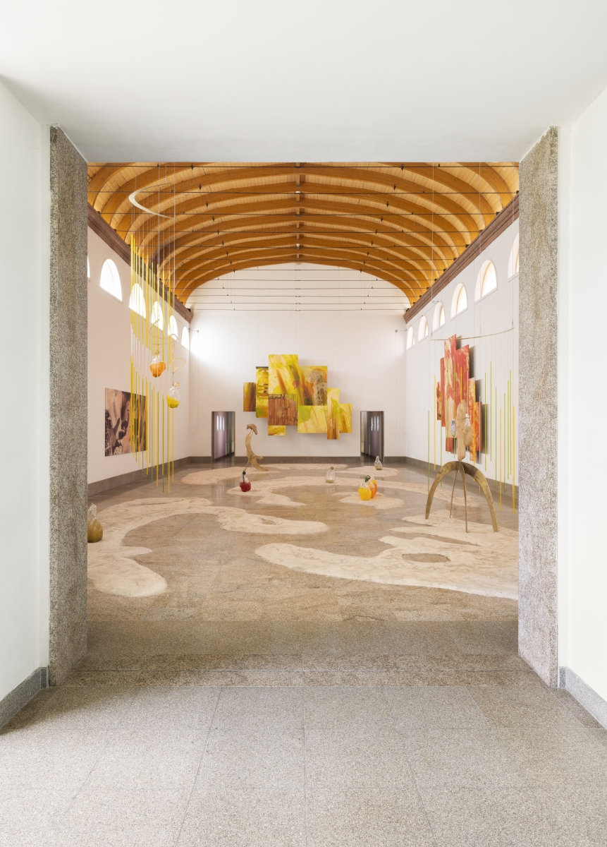 The installation created for the nave by Ittah Yoda— a duo made up of Virgile Ittah and Kai Yoda— is initially captivating by the scent it emanates. Synthetic perfume intermingles with the scent emanating from an island of tuff, sound effects and windows are covered with coloured Japanese paper: the relationship with the work is sensual and total. A blend of sculpture and painting, Never the same Ocean reveals how Ittah Yoda's work weaves back and forth through time (references to prehistory and infinite possible futures), as well as the use of physical elements reinterpreted digitally (organic materials nourish the work based on various technologies, AI, 3D models, virtual reality). Since 2021, the duo has been using phytoplankton as the matrix for their work: specimens of this microorganism thought to be responsible for much of the world's oxygen production grow in glass sculptures hand-blown by artisans. Like Pierre Huyghe, among others, Ittah Yoda works towards the creation of ecosystems, in the wake of object-oriented philosophies, according to which reality can be structured independently of human consciousness.