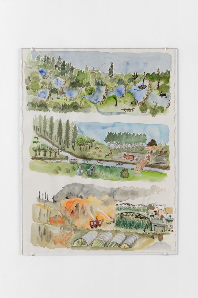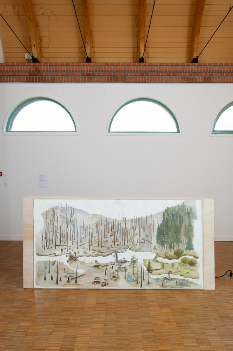 The integration of an intimate relationship with time, both because the works carry within them references to different temporalities, and because they themselves are bound to evolve over the course of the exhibition, creates a subtle link between Ittah Yoda's installation and Ilanit Illouz's breathing, weeping prints upstairs. For several years, Ilanit Illouz has been working in the Wadi Qelt valley in the Judean desert surrounded by a natural frontier, the Dead Sea. The drying-up of the sea is matched by the inexorable disappearance of the desert, in a region at the heart of geopolitical conflicts. The artist photographs a landscape in mutation: printed, enlarged and cropped, her photographs are manipulated with salt taken from the site. Bathed, sprinkled, watered: salt acts as a developer and recalls the technical history of photography— the image is recomposed, and the link between material and support becomes consubstantial. Salt's effect on the image is to gradually turn it into an acheiropoietic, non-human-made image. For several years now, Baptiste Morizot has been calling for the development of interspecific alliances between living humans and non-humans, in particular to enhance “trajectories of transformation of territorial uses towards practices that are generous to the relationship between more emancipatory human activities and ecosystems as a whole.”2 The diplomatic metaphor lies at the heart of Suzanne Husky's research, initially inspired by Amerindian myths, on the role of the beaver in the proper functioning of an aquatic ecosystem. Embodied in a series of luminous watercolors, a film about a Vermont naturalist, and soon a manifesto in dialogue with Baptiste Morizot, his work aims to enable the effective reintroduction of beavers where they are no longer present. Embodied in a series of luminous watercolors, a film about a Vermont environmentalist— and soon to be manifesto in dialogue with Baptiste Morizot— her work aims to enable the effective reintroduction of beavers where they are no longer present.