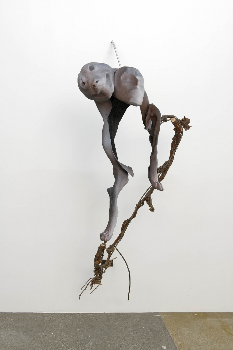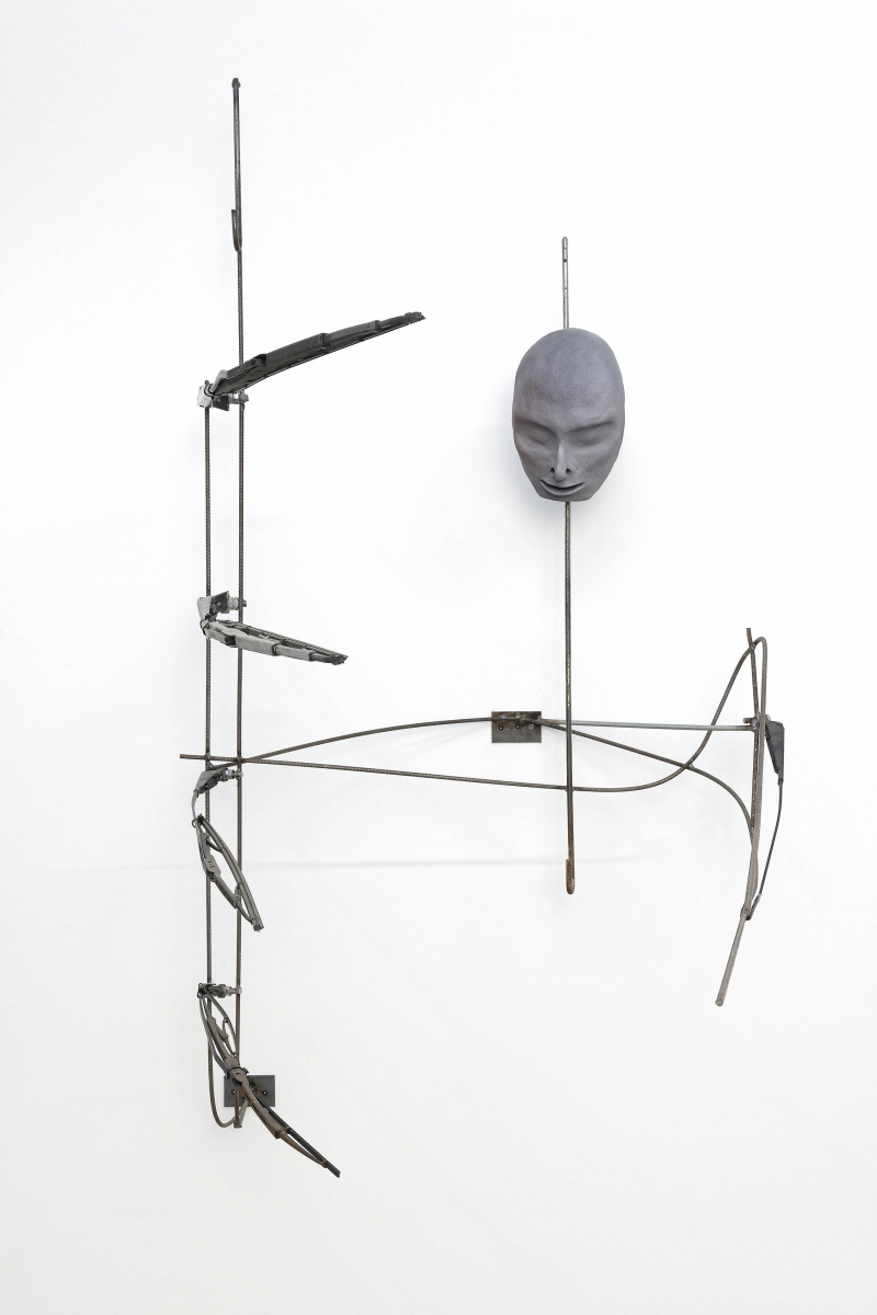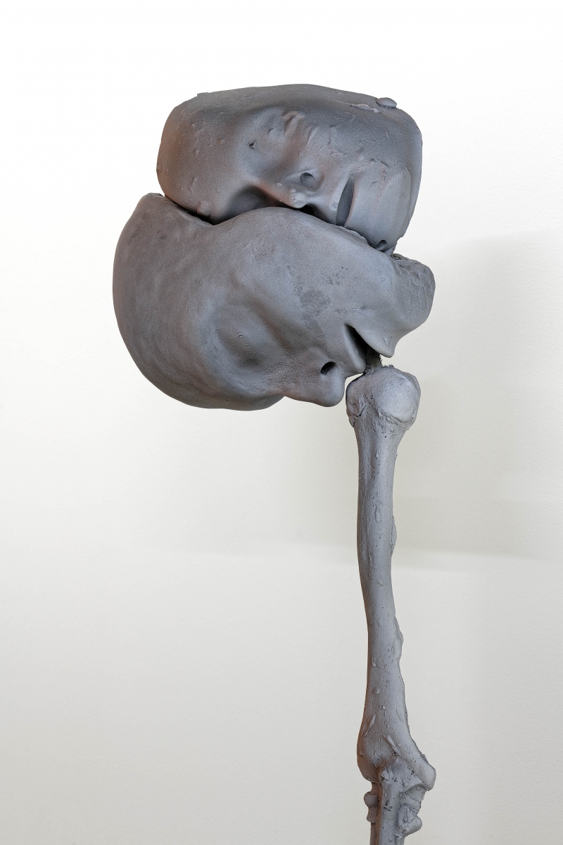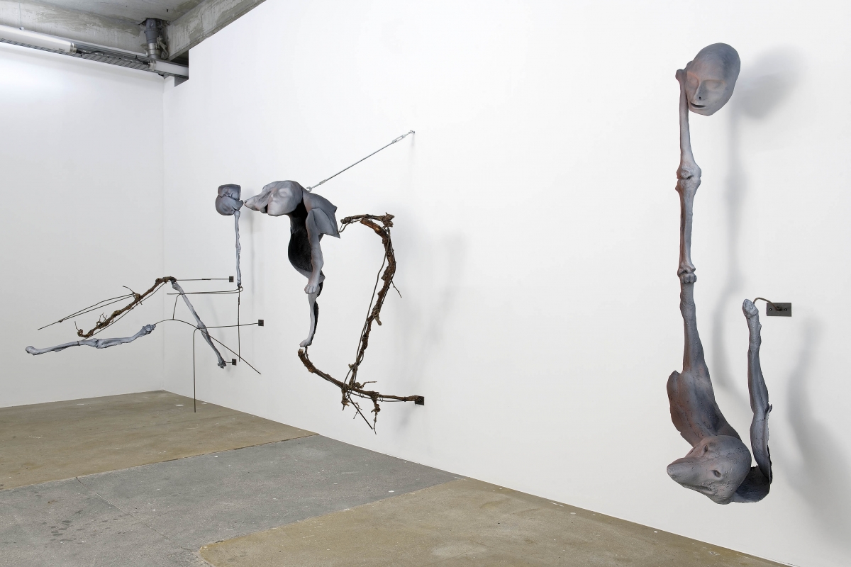 Six sculptures can be seen in the exhibition, five of them in relief, arranged serially on a specially retracted wall. They are immersive anthracite grey assembled beings full of contrasts, hollow casts of plants, animal parts and CPR dolls connected with metal rods, half moulded, half skeleton, partly made of industrially manufactured materials such as metal, mineral resin or quartz paint, partly formed from the grown wood of grapevines. The creatures appear to be under tension, as if they are about to make a movement, yet motionless in their expression. Cenci's series of sculptures is entitled figureheads, a reference to the historical figureheads that were considered patron saints for sailors. The fact that seafaring must be seen as the driving force behind early capitalist expansion plays a role here. In a separate room the sculpture dry salvages (lady), a three-legged, Janus-faced creature, half human, half animal, half rod, half bone, can be seen. Cenci's title refers to the third part of Four Quartets, the great late poem by T.S. Eliot, in which the poet thematizes spiritual survival in the modern age. Based on the four seasons and four elements, they take the reader to four places from Eliot's biography, including the Dry Salvages, a group of rocks off Cape Ann, Massachusetts, which can only be seen at low tide and near which Eliot experienced the rough sea, the elemental force of the sea, in his youth.