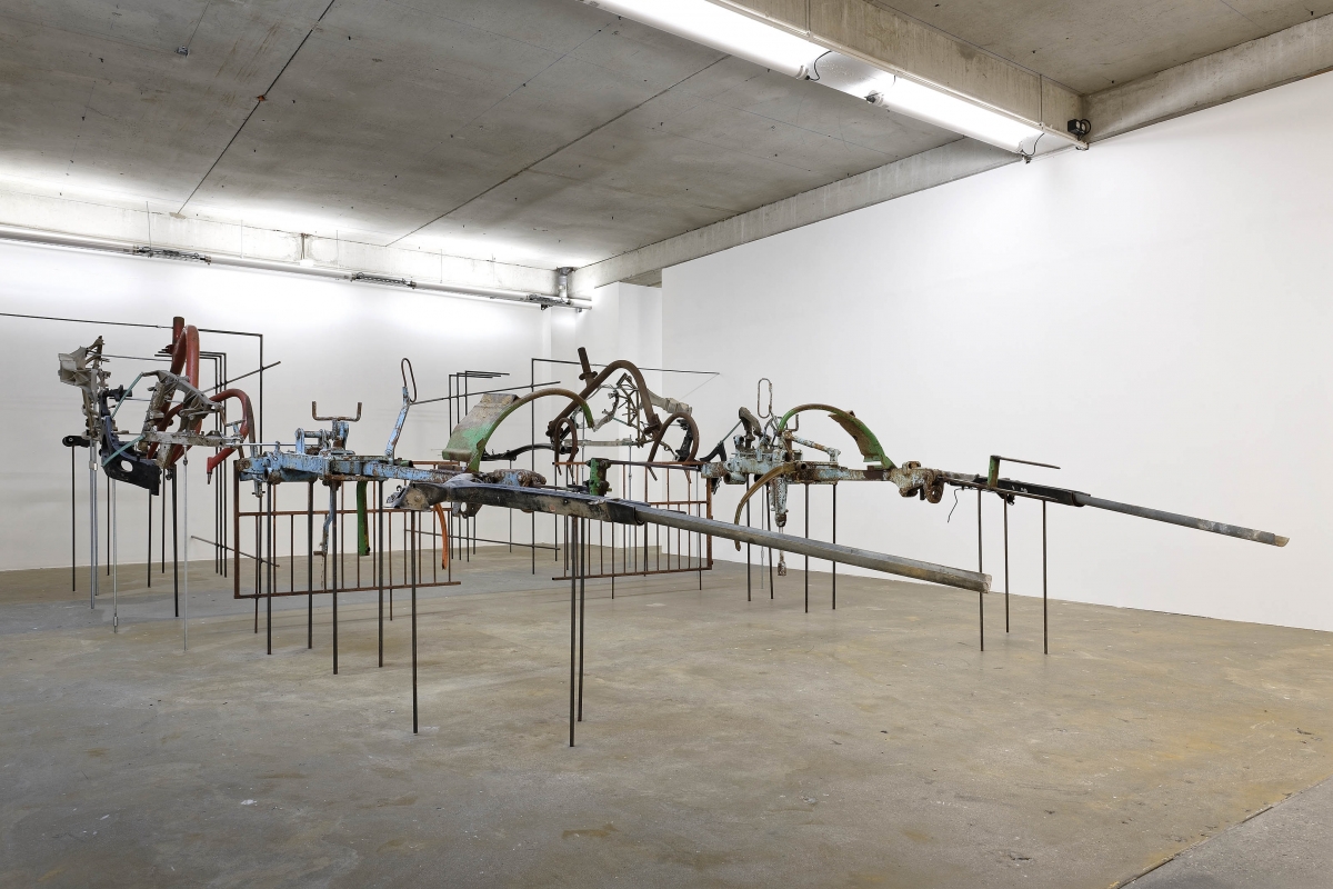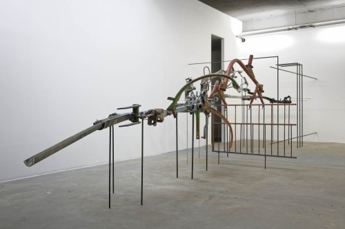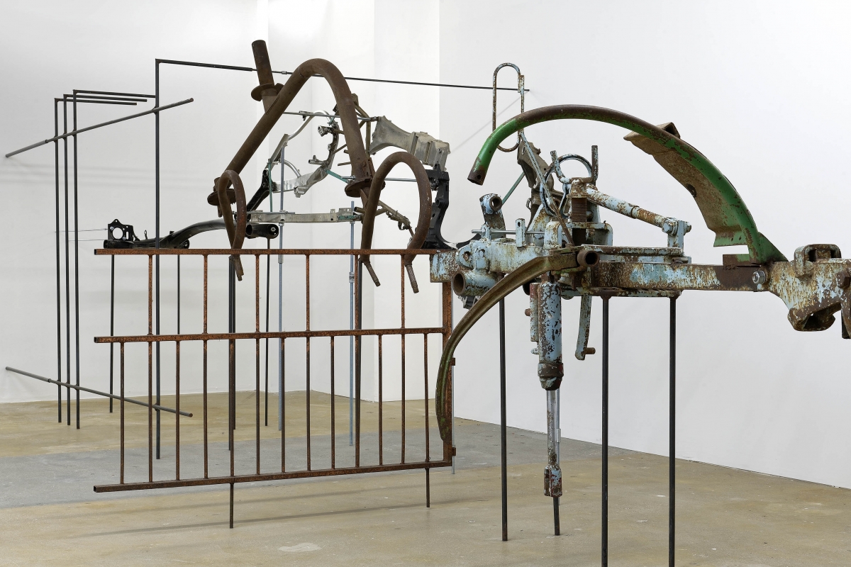 Huge scissor arms open towards the visitors and welcome them. Scissors without bodies, larger than life. They occupy the space in order to take hold of the viewers, to lead them into the centre of the exhibition, into the installation entitled progresso scorsoio. Between two almost identical, playfully constructed arms made of mechanical machine parts, of iron, of aluminium, held together by a metal construction, the industrial age seems to tilt into the present, the construct of progress seems to pause between the past and the future.