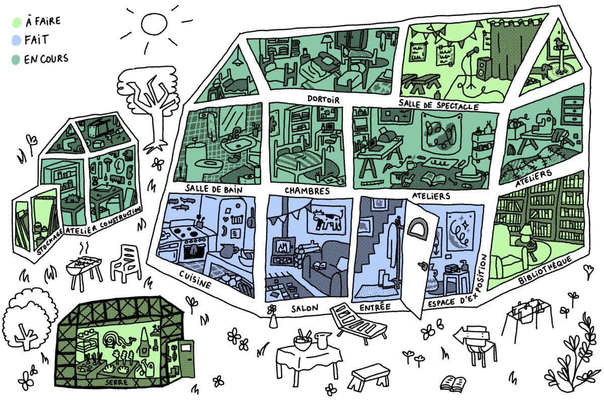 SD: As we have few expenses since we don't pay rent, we have established a rent per person and per month of about 25€ which is used to pay insurance and property tax. The association generates funds with events, a donation based bar and canteen, and there are common funds for the collective expenses, like the food. It's all donation based. It works quite well and balances itself out. We manage to pay the expenses, at least for the moment.