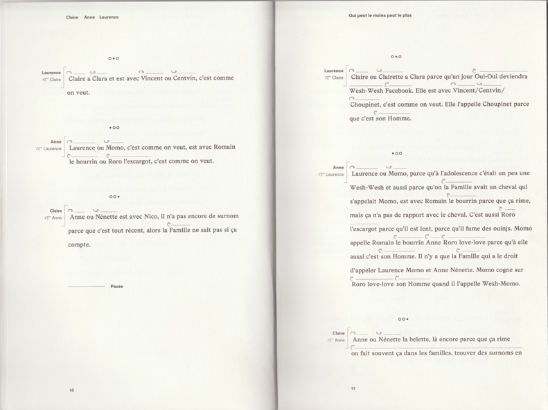 Anne Le Troter: I collect speech and I write. I started recording work in mono: stories, but above all techniques that I’d invented to replay the world in my own words. These works now constitute a database. Another part of my work consists of pure writing. In L’encyclopédie de la matière for instance, I have written about the transformation of fundamental materials (wood, metal, sand, etc.) without using the tools of knowledge. This results in a kind of contemporary poetry. I have also written a play that brings a language into play that my sisters and I developed by trafficking syntax.