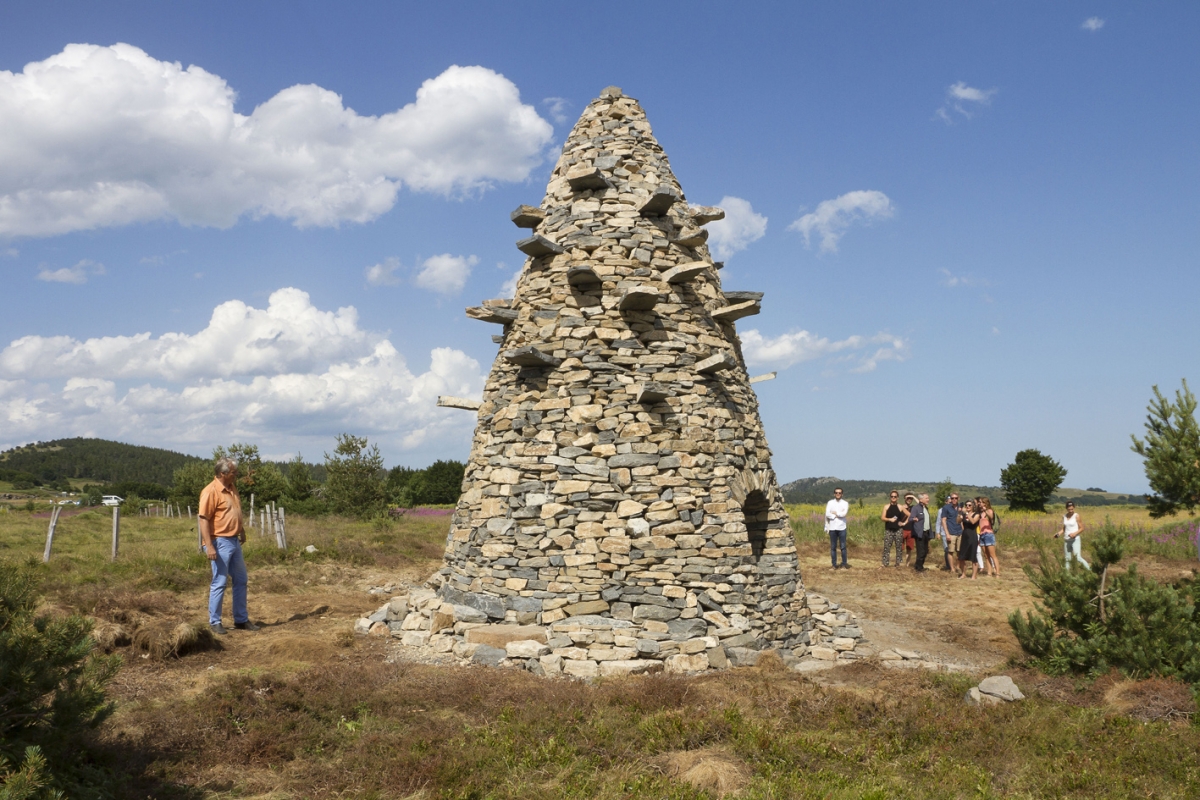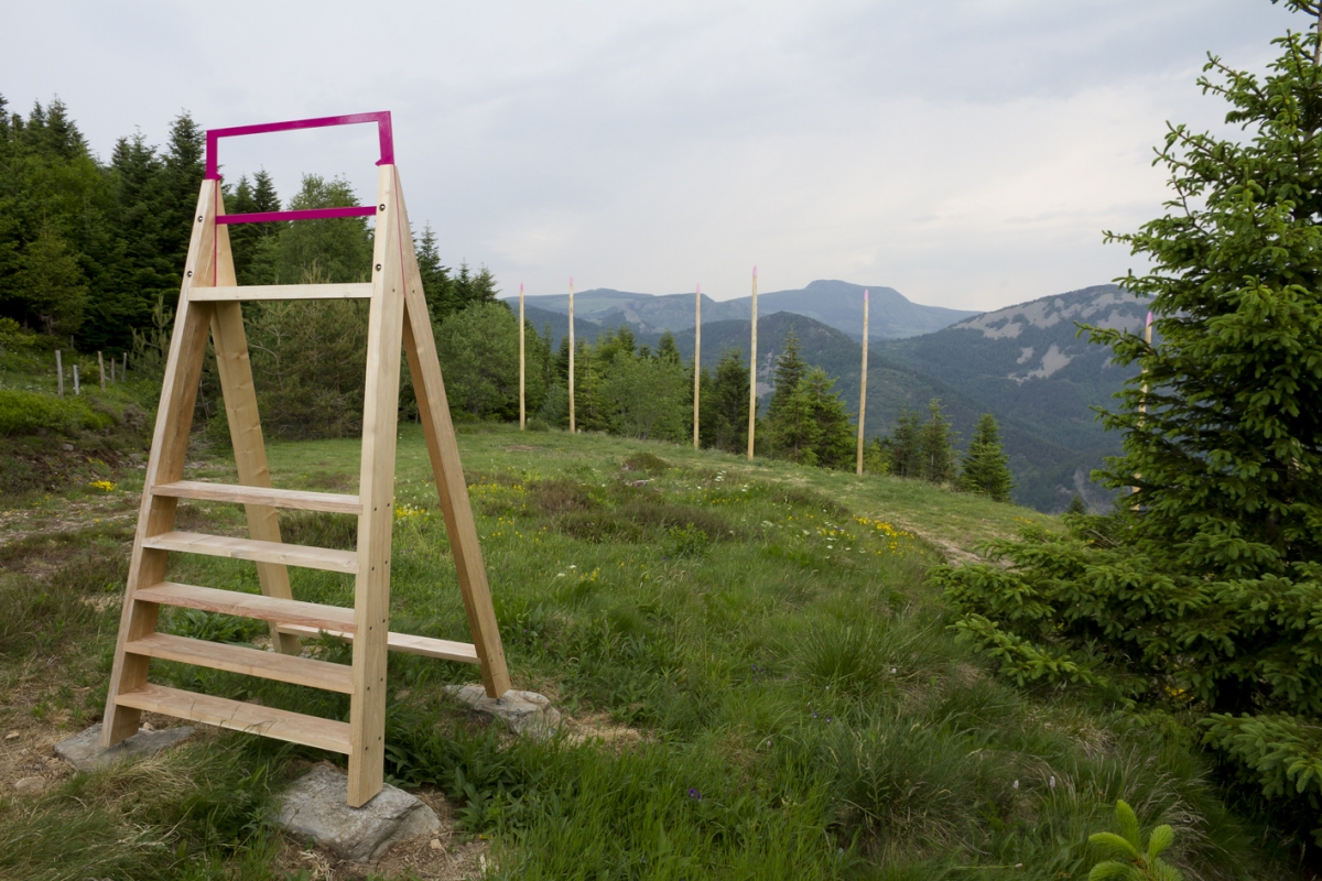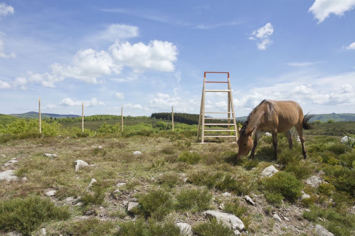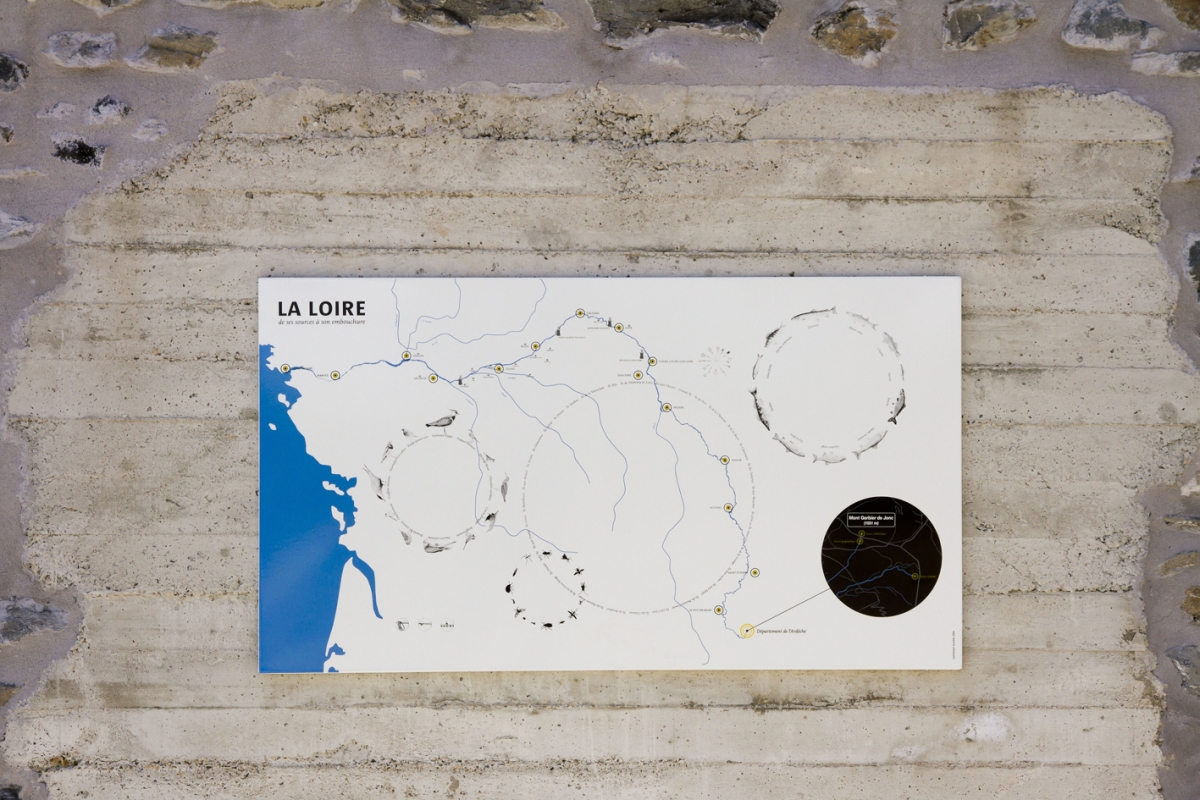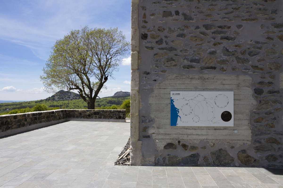 The artistic creations of the trail, by revealing or occasionally reflecting the outline of the watershed, call on specular and optical devices: the intermingling of on-stage and behind-the-scenes (seen and unseen), disorientation of perception using inclined reflective surfaces in which we cannot see ourselves (Thidet’s installation), the abstraction of high-angle shots (the Loire filmed from the sky by Leroi), a 360° panorama syncopated into a reel of ‘windows’ with a kinetic effect (Le Phare, Friedmann), visual condensation and diffraction through anamorphosis (Varini)… The outdoor furniture also offers multiple perspectives for broaching the landscape. Playing on the plasticity of markers and situations, the artworks allow us to experience the variability of viewpoints and lead to spatial displacement – either side of the geological line – but also sensitive and metaphorical ones. In parallel, six “Mires”3 stations are dotted along the itinerary. Arranged in natural viewing platforms, elegant masts made of bevelled wood form indexes, raised to various heights. Thanks to a scale and viewing frame, we can adjust the level of our own horizon so as to project ourselves more easily within the landscape and mentally link up the colourful points. Above and beyond each span, a fragment of the ridgeline is thus surreptitiously outlined before our eyes, as though we were tracing it with our fingertip on a map. By following the trail, we are retracing this line and walking along a life-sized open-air cartography. La Tour à eaux devised by Gilles Clément replays the Mont Gerbier de Jonc in miniature. Finally, we walk around the superb sensitive map4 of the Loire created by Kôichi Kurita, a telluric network as precise as it is blind to any geographical indication.
