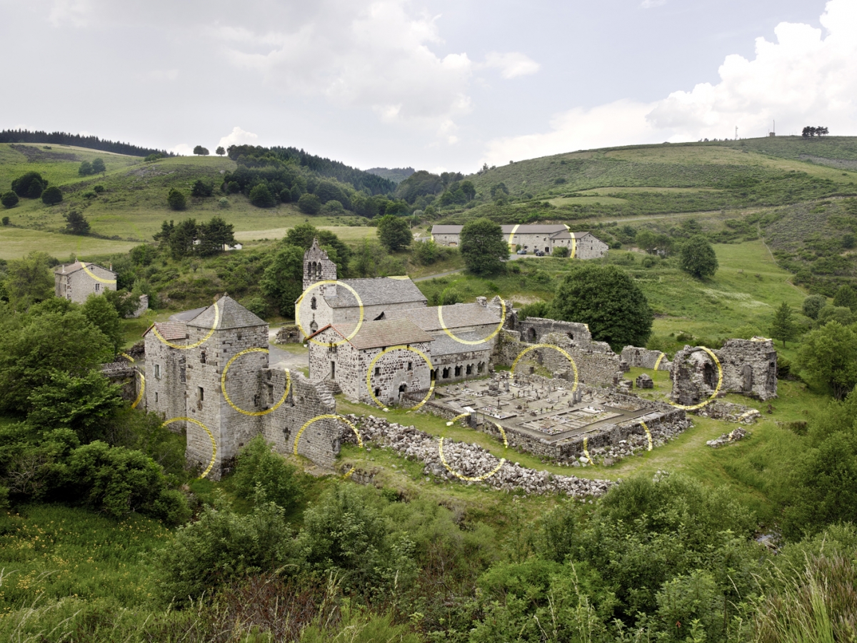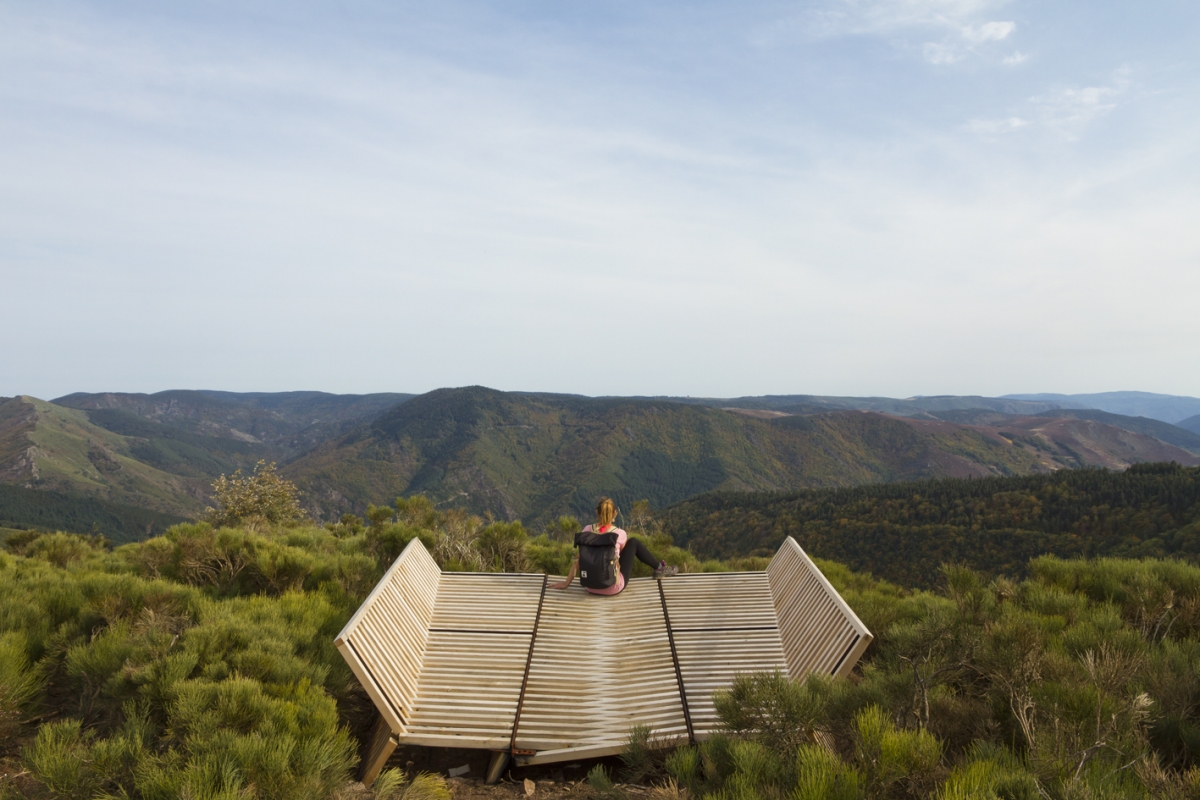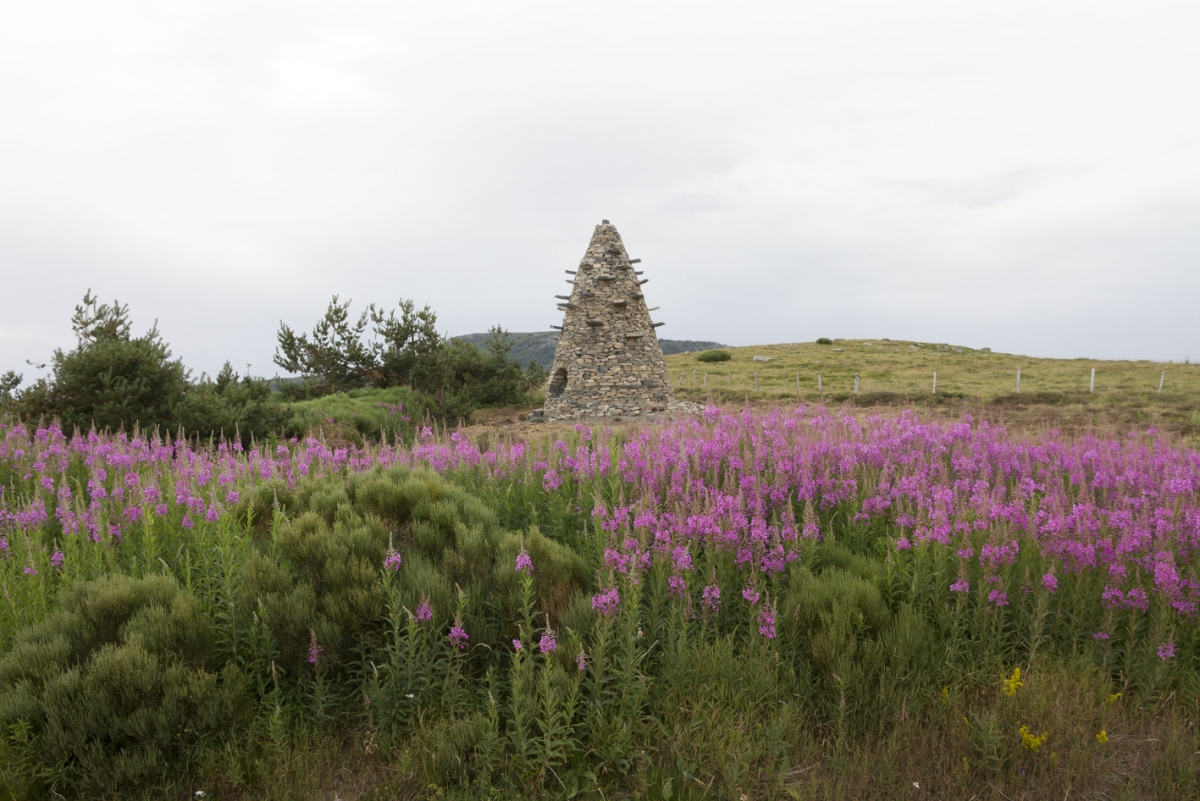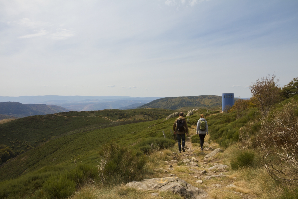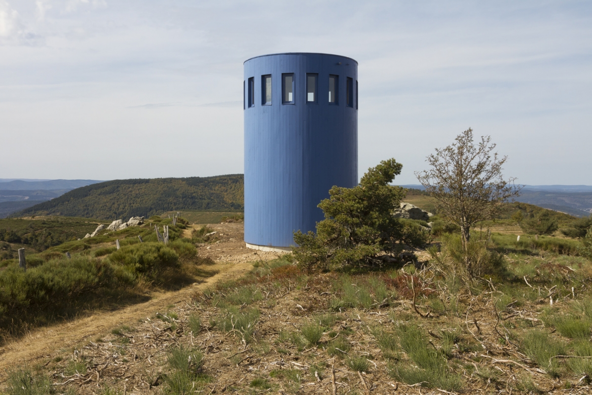 The artistic creations of the trail, by revealing or occasionally reflecting the outline of the watershed, call on specular and optical devices: the intermingling of on-stage and behind-the-scenes (seen and unseen), disorientation of perception using inclined reflective surfaces in which we cannot see ourselves (Thidet’s installation), the abstraction of high-angle shots (the Loire filmed from the sky by Leroi), a 360° panorama syncopated into a reel of ‘windows’ with a kinetic effect (Le Phare, Friedmann), visual condensation and diffraction through anamorphosis (Varini)… The outdoor furniture also offers multiple perspectives for broaching the landscape. Playing on the plasticity of markers and situations, the artworks allow us to experience the variability of viewpoints and lead to spatial displacement – either side of the geological line – but also sensitive and metaphorical ones. In parallel, six “Mires”3 stations are dotted along the itinerary. Arranged in natural viewing platforms, elegant masts made of bevelled wood form indexes, raised to various heights. Thanks to a scale and viewing frame, we can adjust the level of our own horizon so as to project ourselves more easily within the landscape and mentally link up the colourful points. Above and beyond each span, a fragment of the ridgeline is thus surreptitiously outlined before our eyes, as though we were tracing it with our fingertip on a map. By following the trail, we are retracing this line and walking along a life-sized open-air cartography. La Tour à eaux devised by Gilles Clément replays the Mont Gerbier de Jonc in miniature. Finally, we walk around the superb sensitive map4 of the Loire created by Kôichi Kurita, a telluric network as precise as it is blind to any geographical indication.