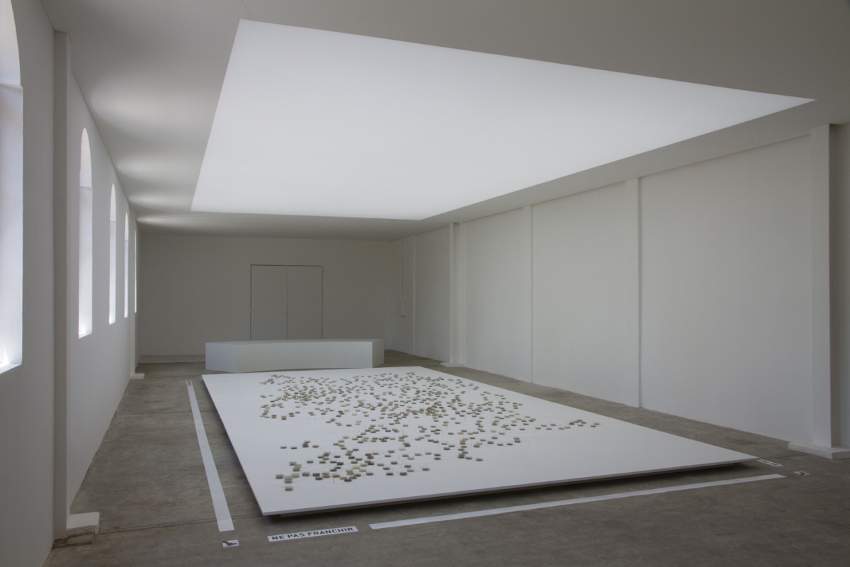 The watershed isn’t a mirage. In the Regional Park of Monts d’Ardèche, it’s a very real ridgeline: the place where the waters are divided and singularly sculpt the landscape by flowing down either the Mediterranean or the Atlantic slope. But like any line, it stems from a mental representation obtained through abstraction. Here, the topographical design or rather, orographic (literally mountain writing) guides the ambitious goal of the artistic pathway directed by David Moinard, based on research by landscapist Gilles Clément. Inaugurated in 2017, the artistic pathway “Partage des eaux” (Watershed) supported by regional, national, and European funding, is deployed over approximately one hundred kilometres,1 spanning the length of this geological line invisible to the naked eye, expressed by six in situ contemporary artworks and by a collection of furniture made of chestnut wood – a native species. These creations are not the ad hoc elements of yet another sculpture park; nor are they interventions of the Land Art variety. The artistic productions by Gilles Clément, Gloria Friedmann, Kôichi Kurita, Olivier Leroi, Stéphane Thide, and Felice Varini are perennial commissions, even if they may evolve according to an entropic model (the inscriptions in gold leaf by Varini on the ruins of a seventh century abbey will be erased over time). Empathetically, all of the creations weave formal, materiological, semantic, narrative, or poetic relationships with each of the historic sites selected, all along the trail that also incorporates the GR7 route. “Ever since humans could talk and make signs, they have created and followed lines,”2 writes Tim Ingold. This history of lines echoes that which brought cave reliefs to life, some 36,000 years ago, in an Ardèche that was then more heavily frequented: the history of the Chauvet Cave.
