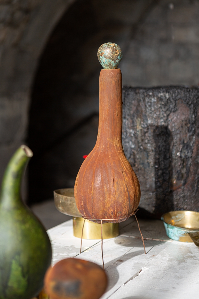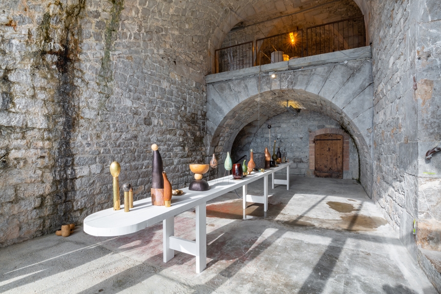 The works and their exhibition context thus play at mutually showcasing, parasiting, or counterbalancing one another. Martin Belou, whose exhibition I was able to visit, deliberately explored the possibilities of interaction, or even contamination, between the architecture and the artworks: several gourd compositions were positioned in such a way as to echo the mould developing along the many infiltrations of the walls, threatened by its invasion. The artist even asked Christophe Levet, the exhibition photographer, to include the details of these plant and mineral compositions in the documentation of his installation. So once again there was a question of point of view and framing, a choice of openness and exposure, at the expense of the protection the fort initially provided.