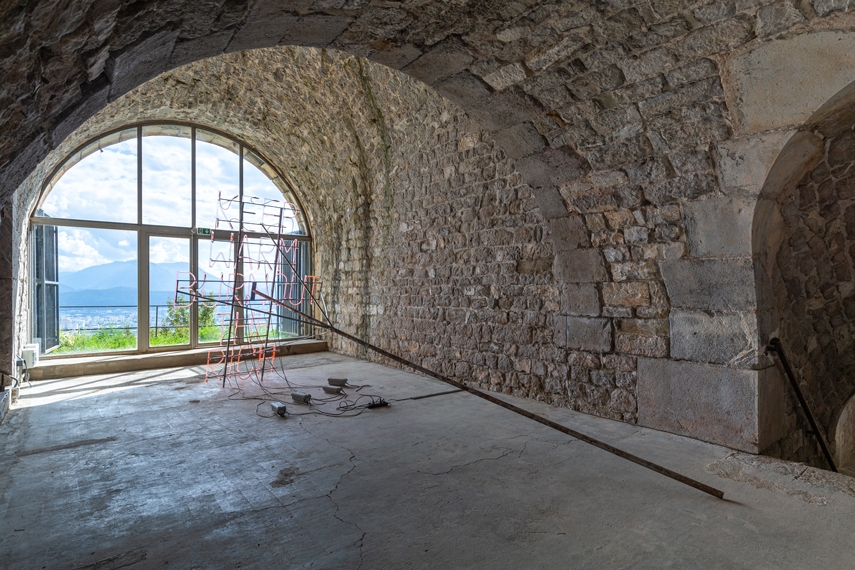 Comprising four vaulted rooms arranged in cascade over three successive levels, the first contains two bay windows opening onto a view of Grenoble. The architecture in dressed stone is that of a defensive fort: the thick walls provide protection, while the openings afford views – designed for surveillance and taking aim. Today, they symbolically draw the city into the art centre. So its architecture perfectly echoes its paradoxical visibility, a metaphor for contemporary art itself: whereas the centre faces the city and encompasses its presence, it remains quite invisible from the outside, also due to its complicated access.