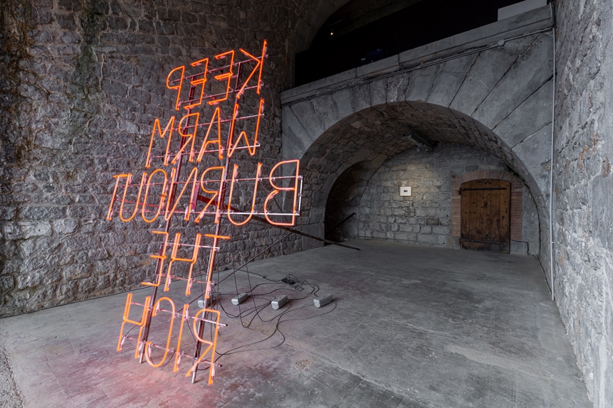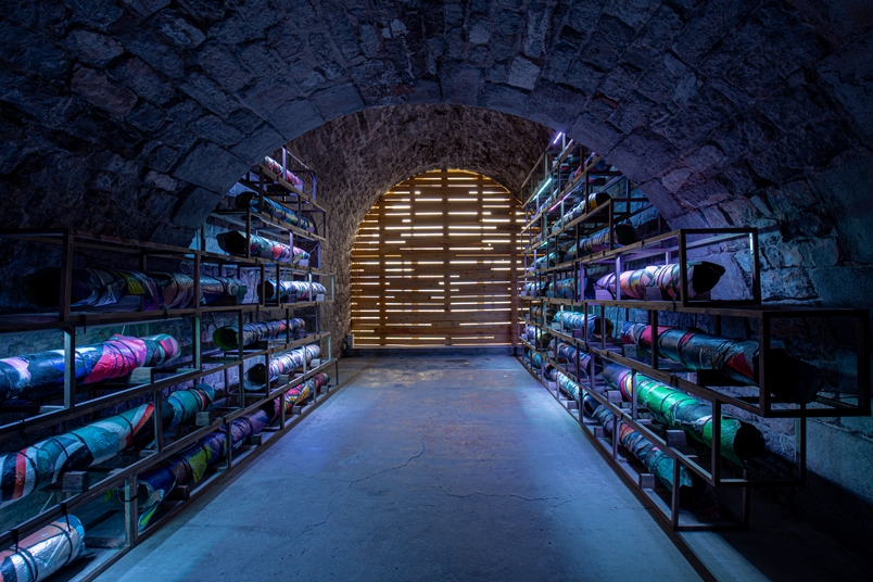 Some, like Martin Belou, chose to play with the plunging view, as seen from the railings. He extended the cascade architecture by creating a closed water circuit that wound between the floors, through a series of patinated gourds, placed on tables made out of the offcuts of Vincent Mauger’s installation. The latter had opted to restrict gazes and partition off spaces. He broke up the existing architecture through the construction of an inclined floor to accommodate a sculpted breezeblock landscape. Other artists, like the Nøne Futbol Club, placed their works so that they were oriented towards the city, facing the large bay window. Conversely, Thomas Teurlai decided to obstruct the windows to accentuate the subterranean atmosphere of the vaults, hosting a collection of graffiti sampled from their original walls and stored, like archaeological artefacts, in a museum storeroom-style display.