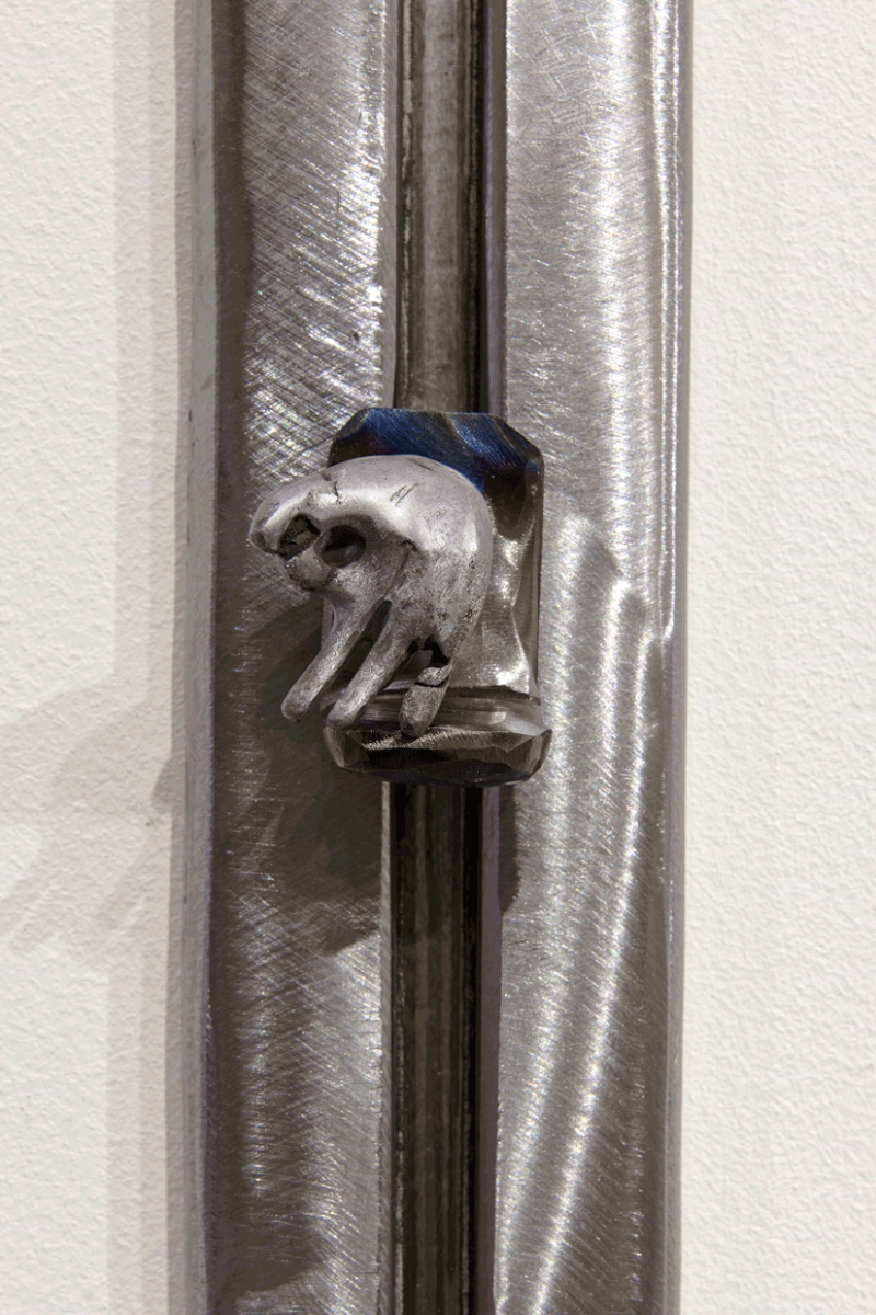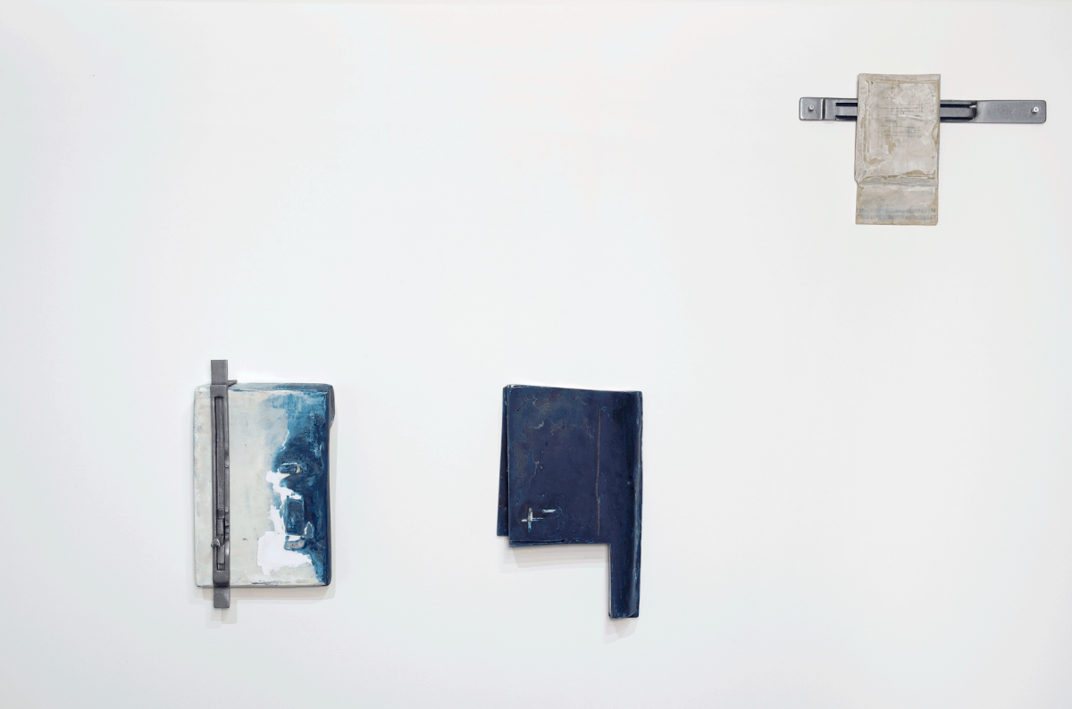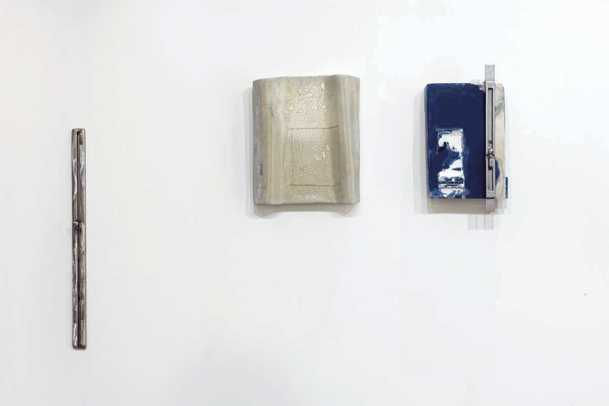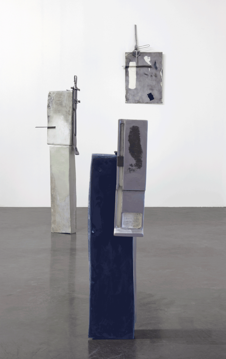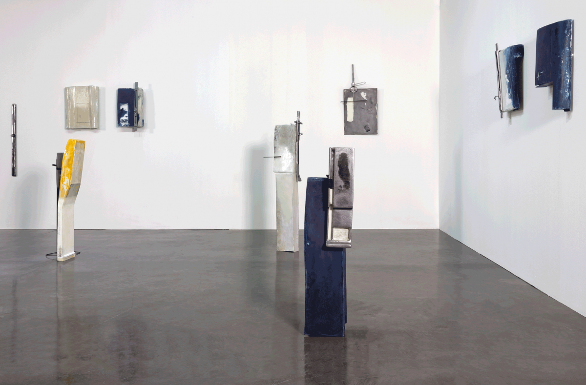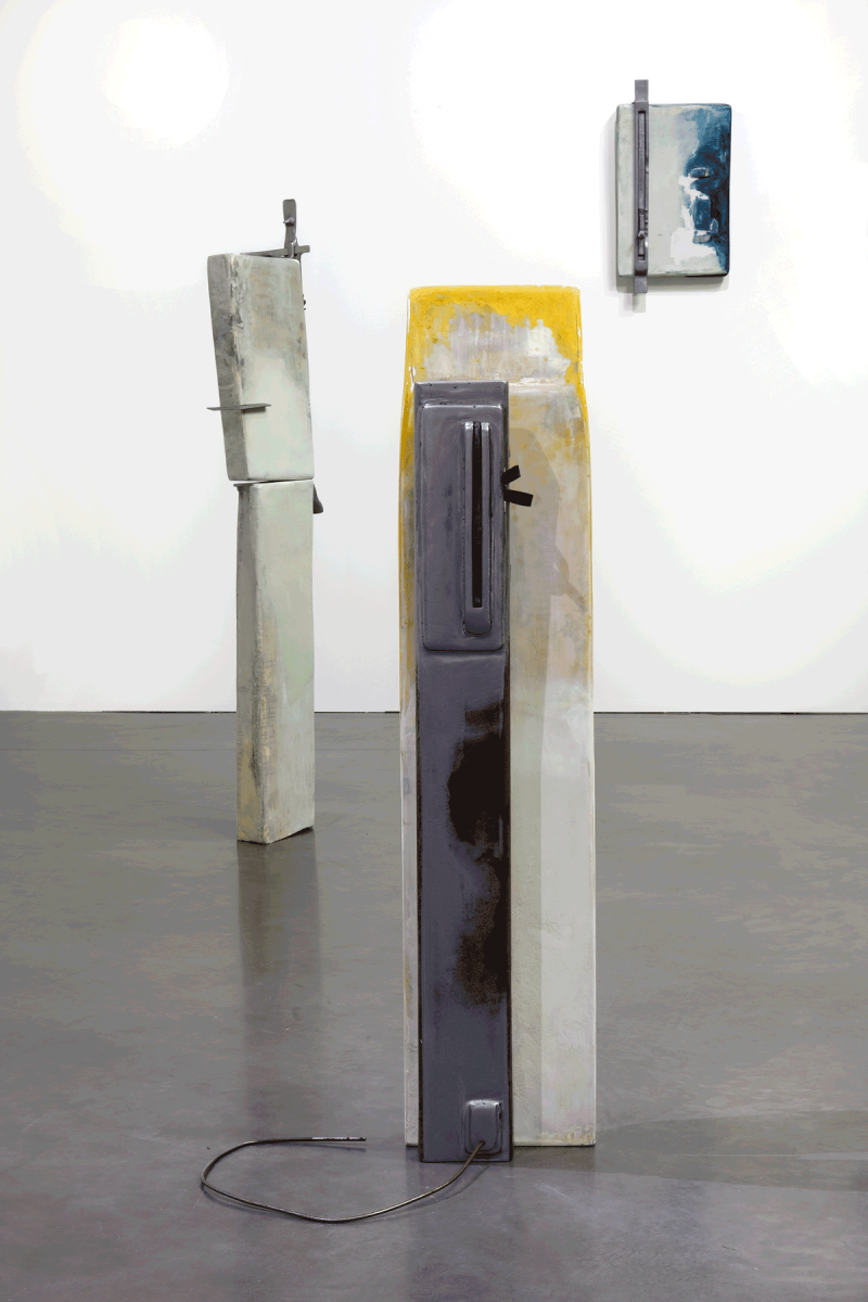 Margot Pietri’s floor sculptures are based on a balance between materials and even the assemblage of the mural works creates a tension. Metal rulers whose cursors are hands invite us to recover meaning in measurement, to involve ourselves emotionally with these terminals whose titles establish a kind of dialogue: 0 notifications, all is well, forget to update, inadequate… Beyond the recall of symbolic functions, the artist insists on the variants, the degrees between the moon and the sun, on and off, sadness and joy. Her presentation depends on the moods that her sculpture-totems convey, as much through their colours – from watery blue to the yellow of alarm – as through their deliberately aged or wet look and their forms. The neologism of mfascia formed by the artist – a contraction of the terms ‘empathy’, ‘face’ and ‘fascia’, the membranes that act as binding agents on a bodily scale – enable a fascicle of complex relationships between humans and techniques to be evoked, without denying the affective element associated thereto. The sculptures call for an interaction with bodies, curves, ergonomic angles: there is something about them that invites us to grasp them. At the limits of transitional objects, these terminals invested with beliefs and emotions define new compositional modes; new limits appropriate for expressing the contemporary age.