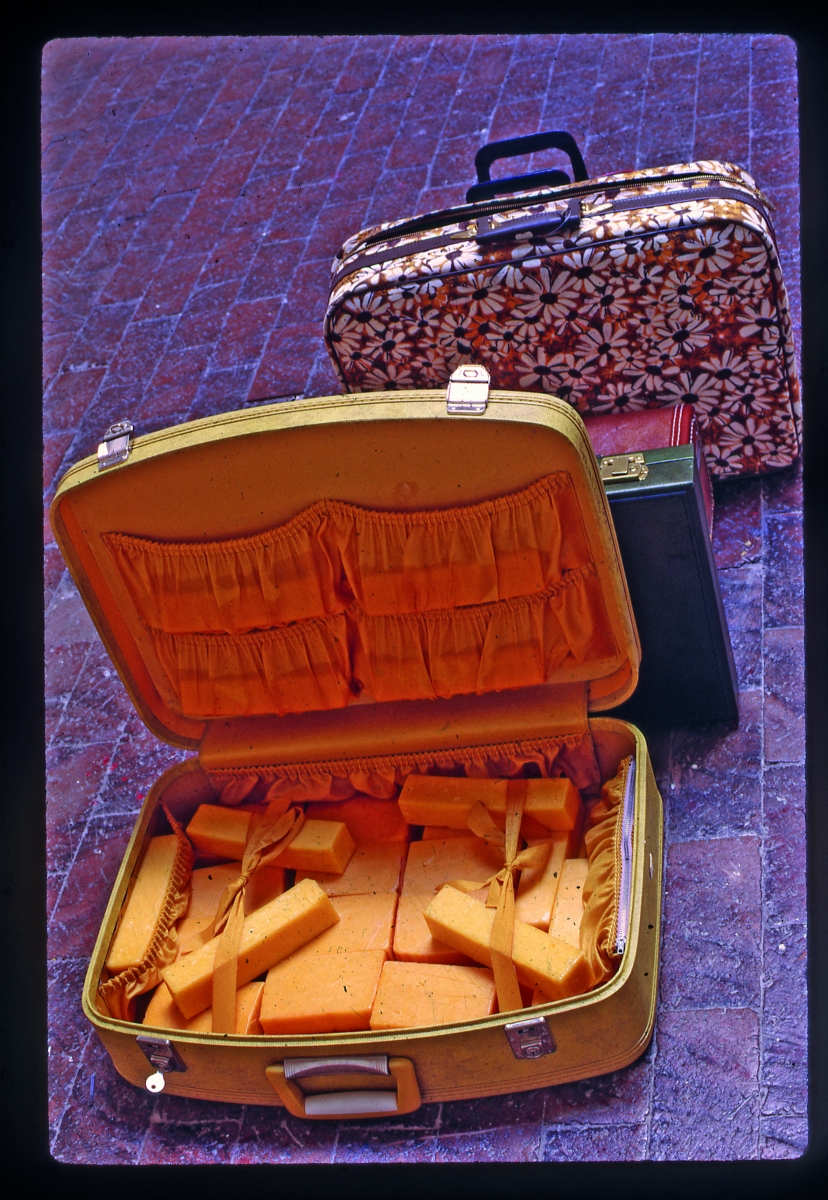 In May 1970, at a time when the first warm rays of the Californian spring were beginning to be felt, Swiss artist Dieter Roth organised an exhibition at the Eugenia Butler gallery (Los Angeles) that was remarkable, to say the least: Staple Cheese: A Race presented only artworks made out of cheese. One of the culinary emblems of the artist’s country of origin was used for unique ends: the main installation, Staple Cheese, A Race, thus comprised thirty-seven suitcases filled with cheddar, limbourg, camembert or brie, which were first shown closed, then opened one after the other, revealing their aroma over time. Accompanying this smallest of monumental works, which extended Roth’s research into cheese begun several years prior: a cheese race on a support, accumulations of cheese in wooden or plexiglas structures, a multiple based on pieces of cheese painted red, etc.