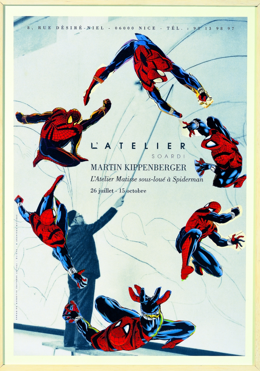 In the early 1980s, the irony of Kippi and his friends from Düsseldorf (Werner Büttner and the Oehlen brothers) opposed the seriousness of the Neue Wilde Kunst. The New Fauves of Berlin advocated a return to expressionism in painting and to the hero worship of the author. Animated by a playful and iconoclastic spirit, the young Kippenberger parodied the masters of the 20th century. In 1985, a photograph by David Douglas Duncan3 illustrated the invitation cards of an exhibition4 by the German artist. On this image, Pablo Picasso poses, dressed simply in a pair of Y-fronts elegantly lifted to his belly button… Three years later, Kippi adopted the same look in a series of somewhat humbling self-portraits. In 1996, the author of the Demoiselles was once again evoked in the series Jacqueline, The Paintings Pablo Couldn’t Paint Anymore. This time, Kippenberger took the liberty of adding the final touches to the series of portraits of Jacqueline Roque begun by Picasso nearly fifty years earlier. In the same year, the silhouette of Matisse appeared in the midst of a farandole of Spidermen. Reproducing the composition of The Dance from 19095, the poster of Kippenberger’s exhibition at L’Atelier Soardi6 proves that the sense of rhythm of superheroes is equal to the masterpieces of the Hermitage Museum.