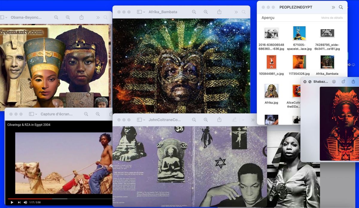 JN: Cheikh Anta Diop is an important figure. When he handed in his thesis at the Sorbonne, it was immediately refused and it caused an academic outcry. It seemed impossible that a certain Egyptian Empire could be black. If you look at a map, Nubia and Sub-Saharan African are nevertheless side by side. It’s like saying that North Africa doesn’t belong to the African continent . . . A lot of ideas must be called into question in the book and it is inherent to historical study that it be reworked with new information. But politically this historical perspective was such a major contribution. Notably at the time of Harlem Renaissance, the movement of renewal of the Afro-American culture in the interwar period. Blackness has become a symbol used later by the Francophone thinkers of negritude: Aimé Césaire, Léopold Sédar Senghor, Léon-Gontran Damas, etc. I created an iconography entitled People in Egypt with all of the artists who referred to Egypt, many of whom came from the African diaspora: Mohamed Ali, Malcolm X, Alice Coltrane, Nina Simone, Beyoncé, or Barack Obama who I caused to appear on a Tutankhamun head. I find that this comparison has incredible power and presents a chapter of what happened before the slave trade. There really was a historical gap for this community and for me the link is the Atlantic. And through the Atlantic, we return to the many living dead present in the ocean. This history resurfaces from the ocean depths. From Mami Wata, the mermaid of the West African coastline to Drexciya, a techno group from Detroit in the 1990s, there exists an entire mythology of children born to female slaves, thrown overboard during the Atlantic crossings under the slave trade. These half-human, half-fish Afro-descendants live on thanks to the witches of the Atlantis School, the Drexciyan empire. They were born out of death . . .